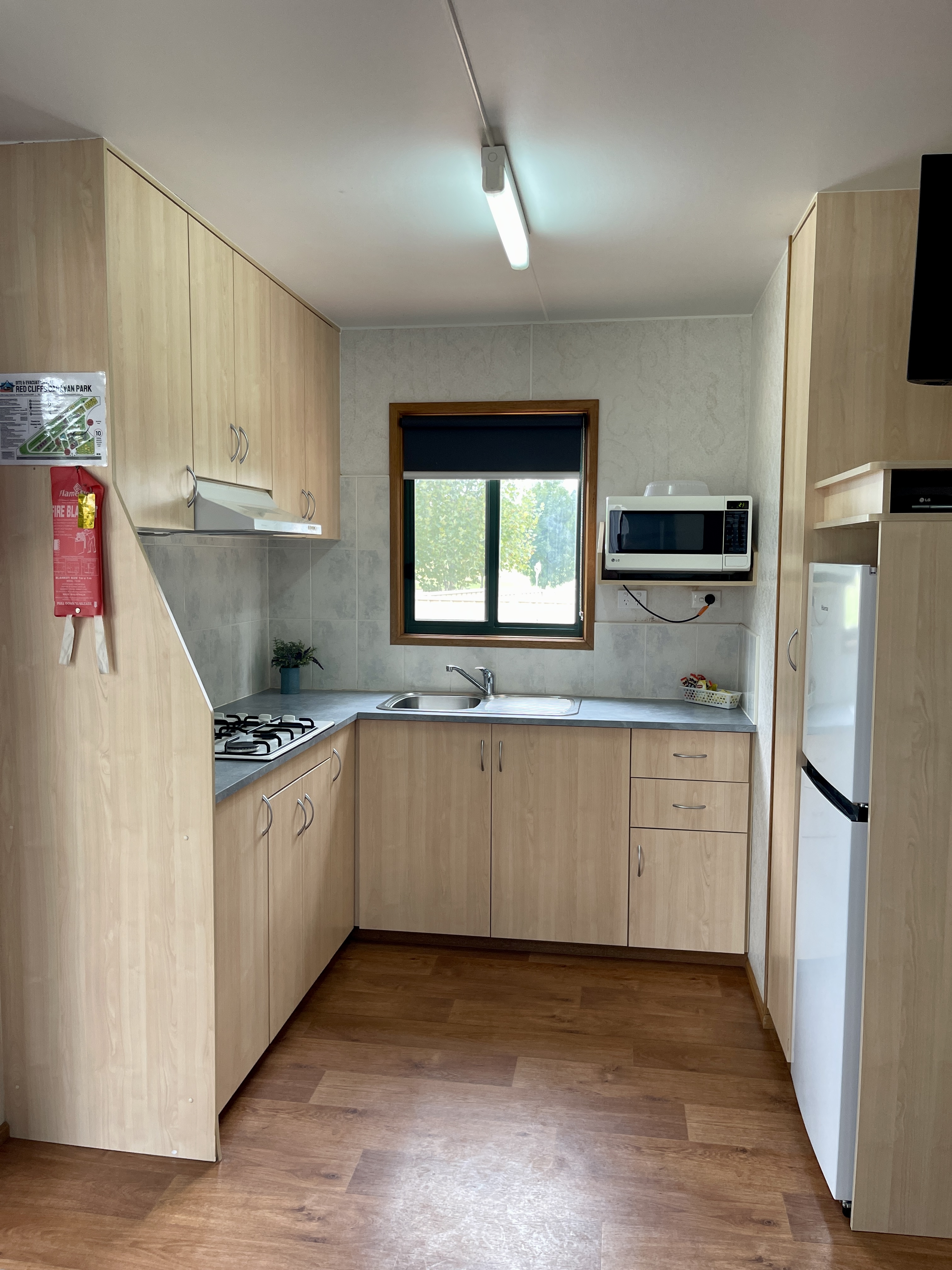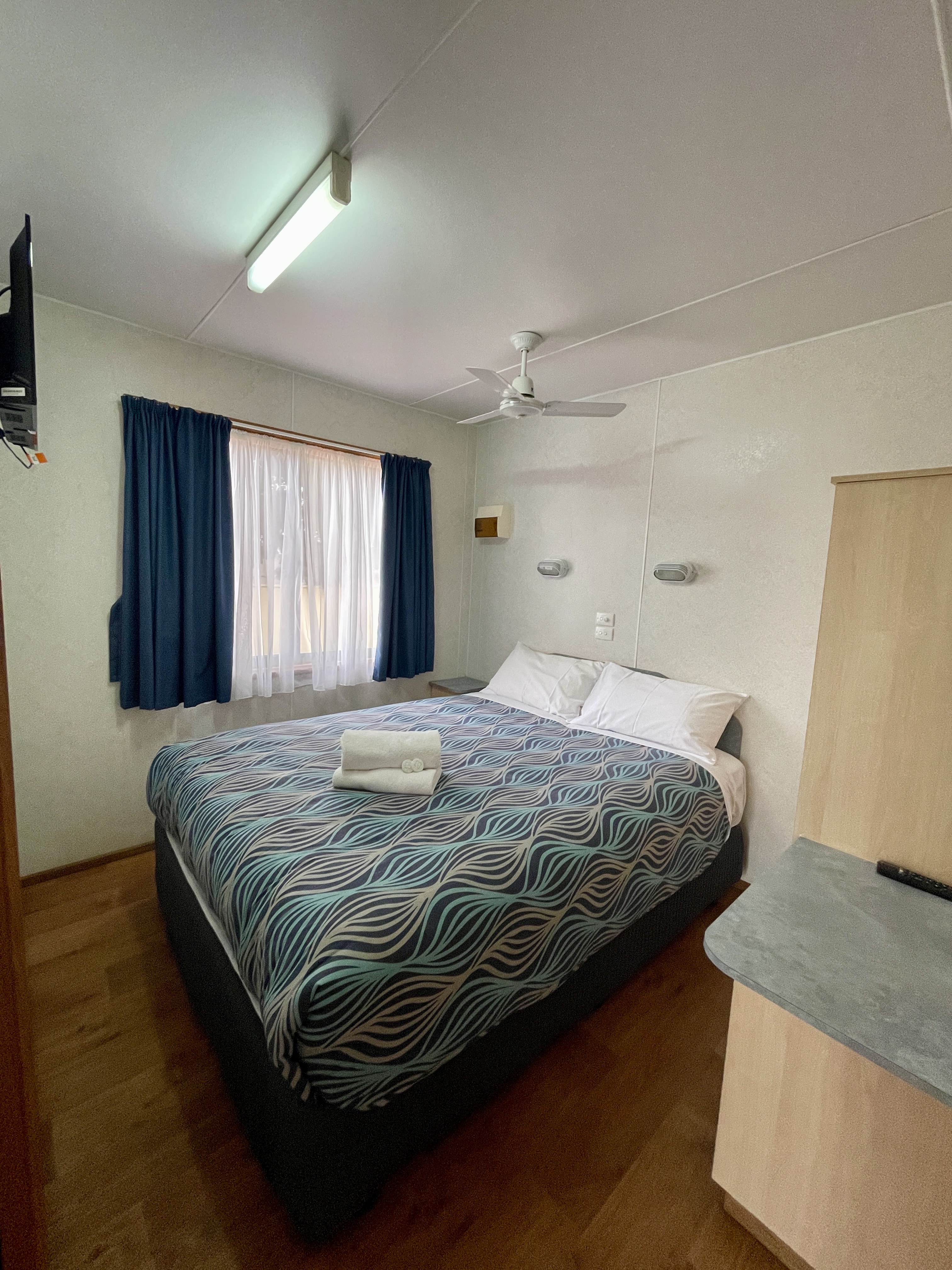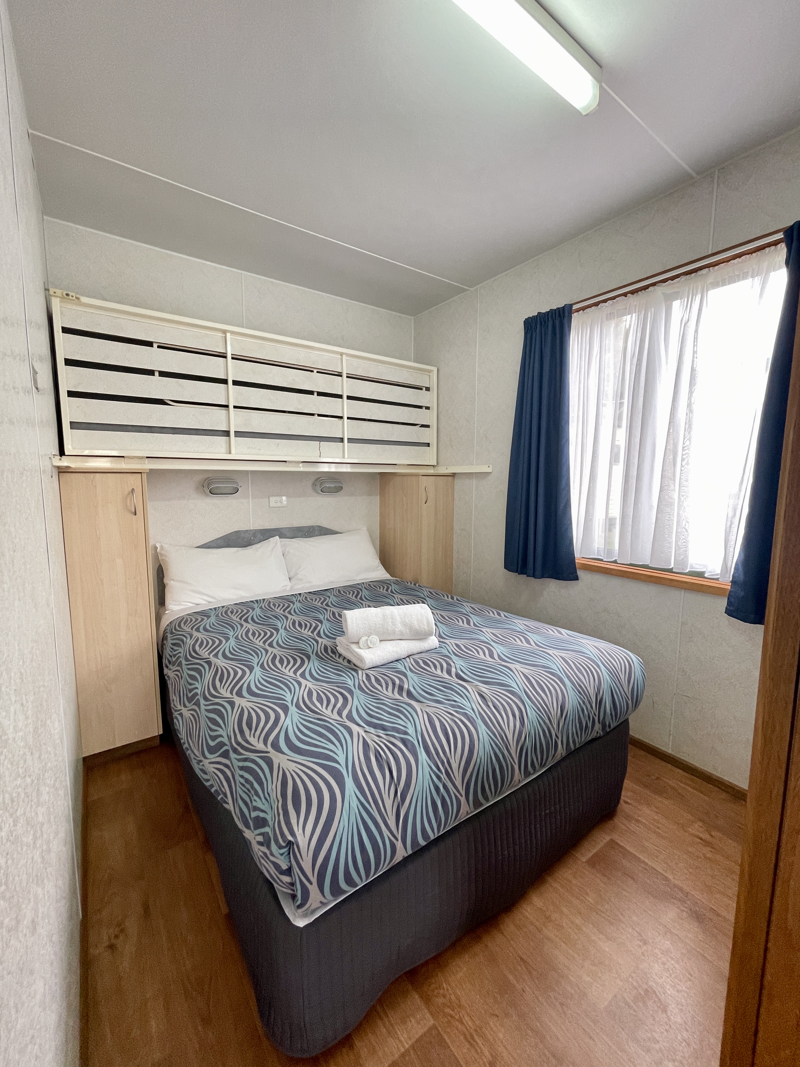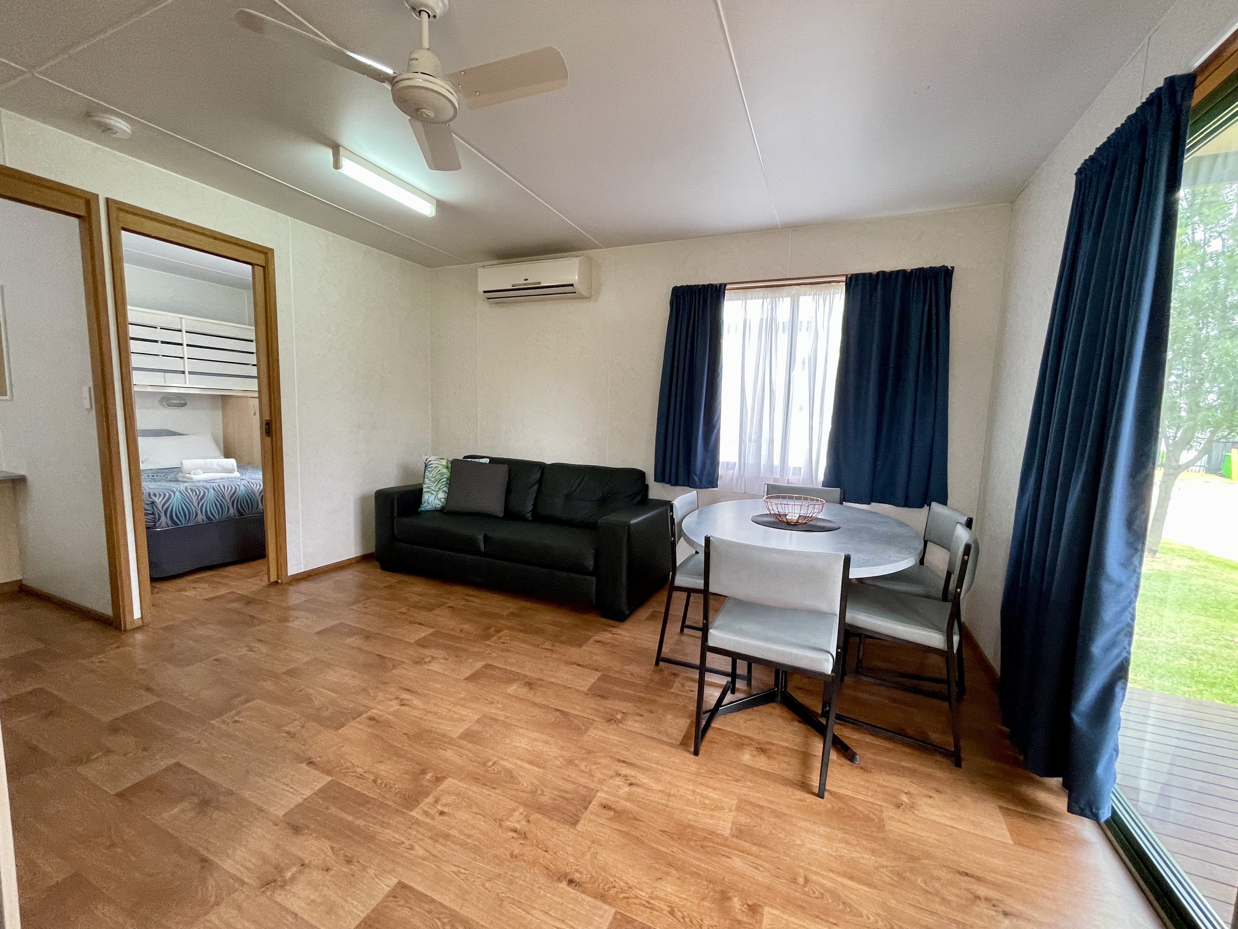 This Superior Cabin is fully self-contained and perfect for two couples. It features 2 bedrooms, with a queen in one room along with flat screen TV & a double in the other. All Linen is supplied & reverse cycle for your comfort. Ceiling fans in the main bedroom & lounge areas.