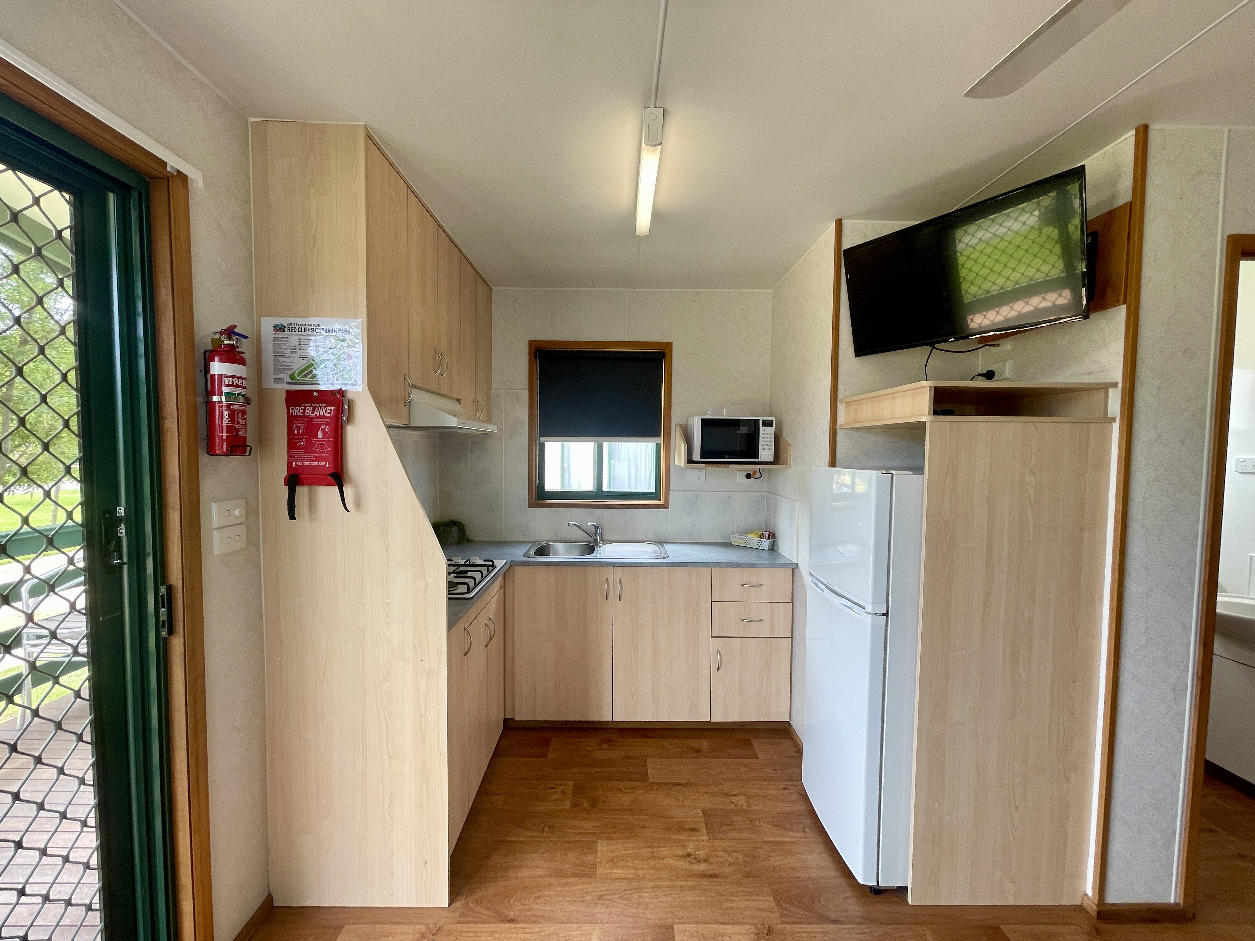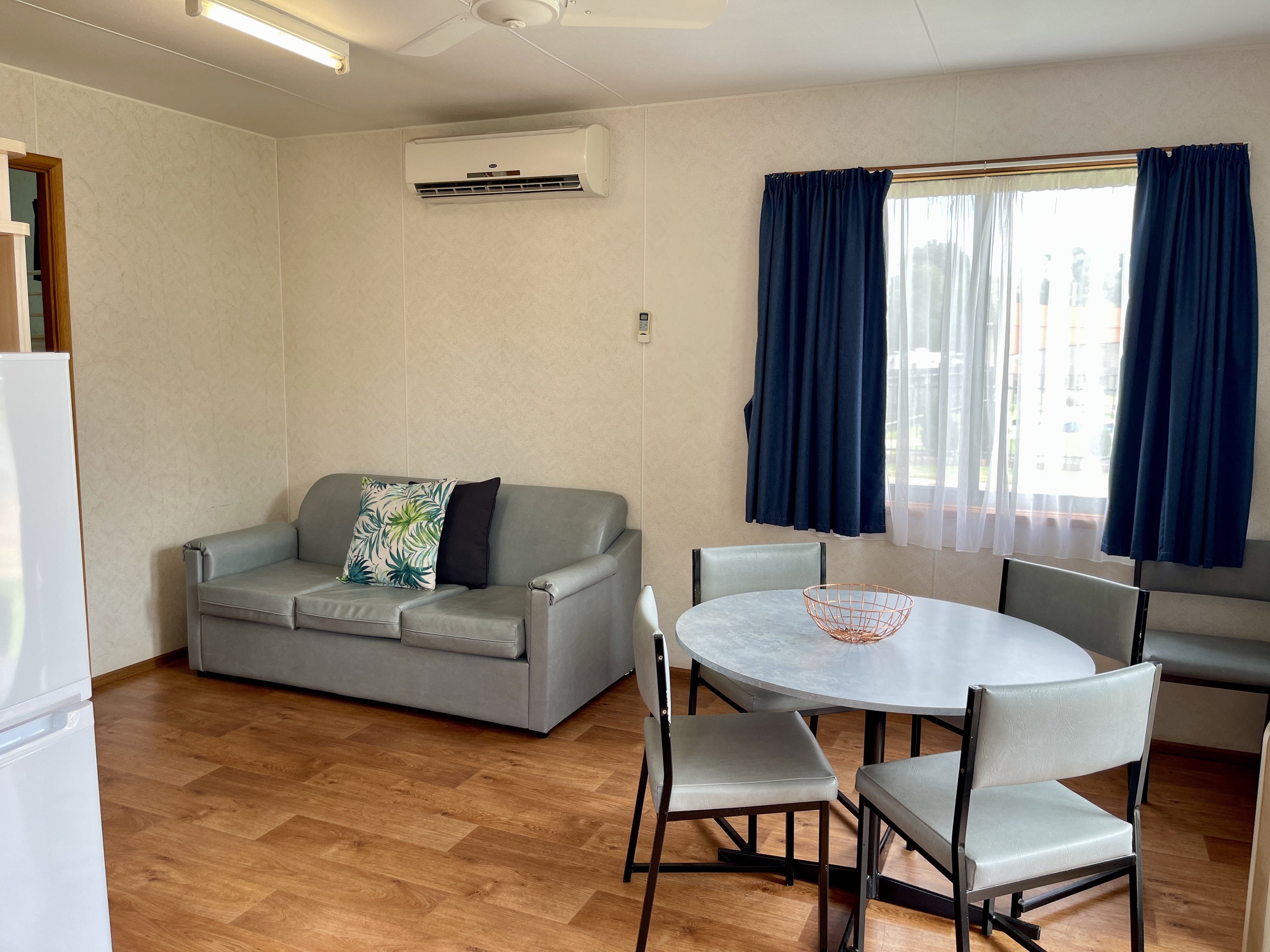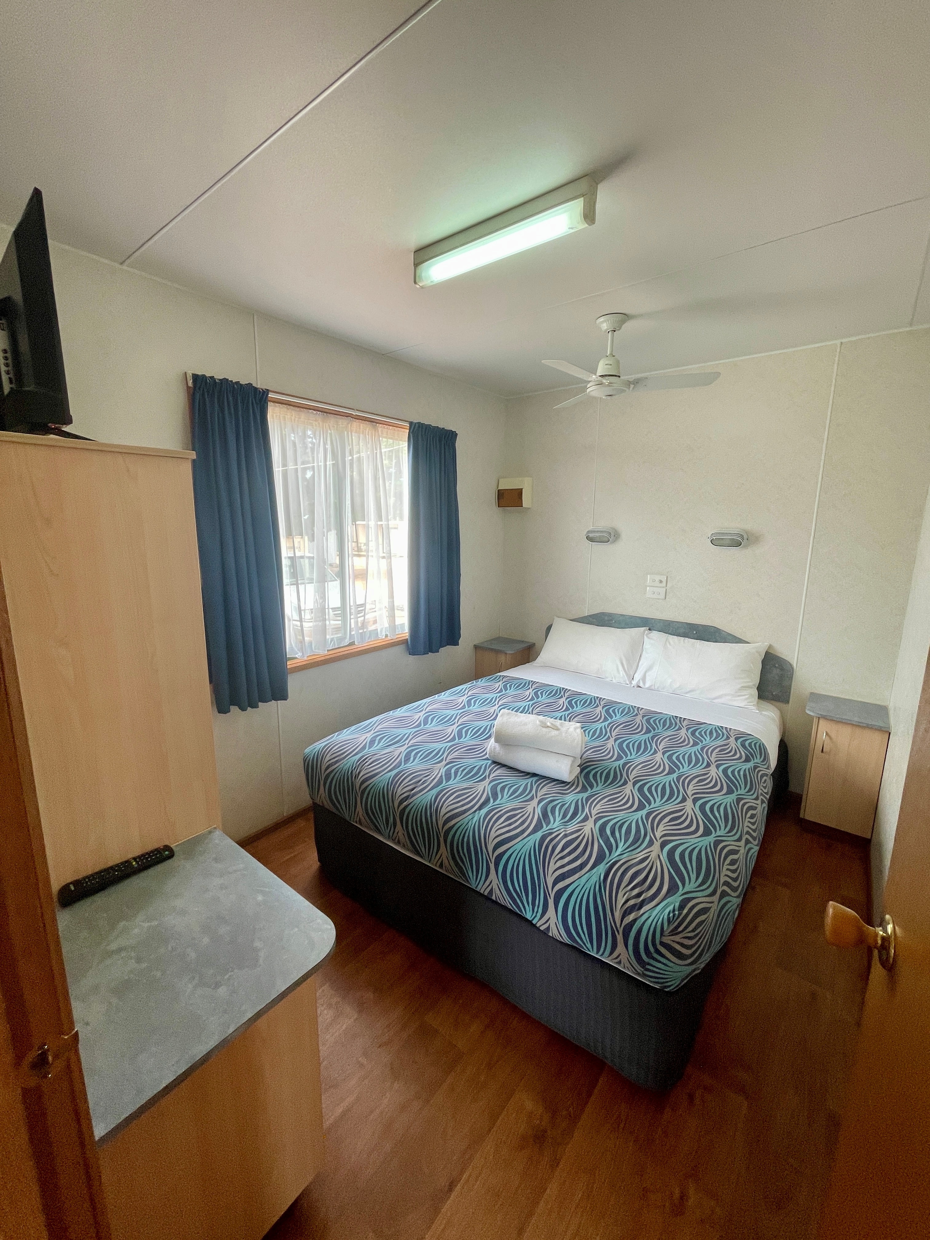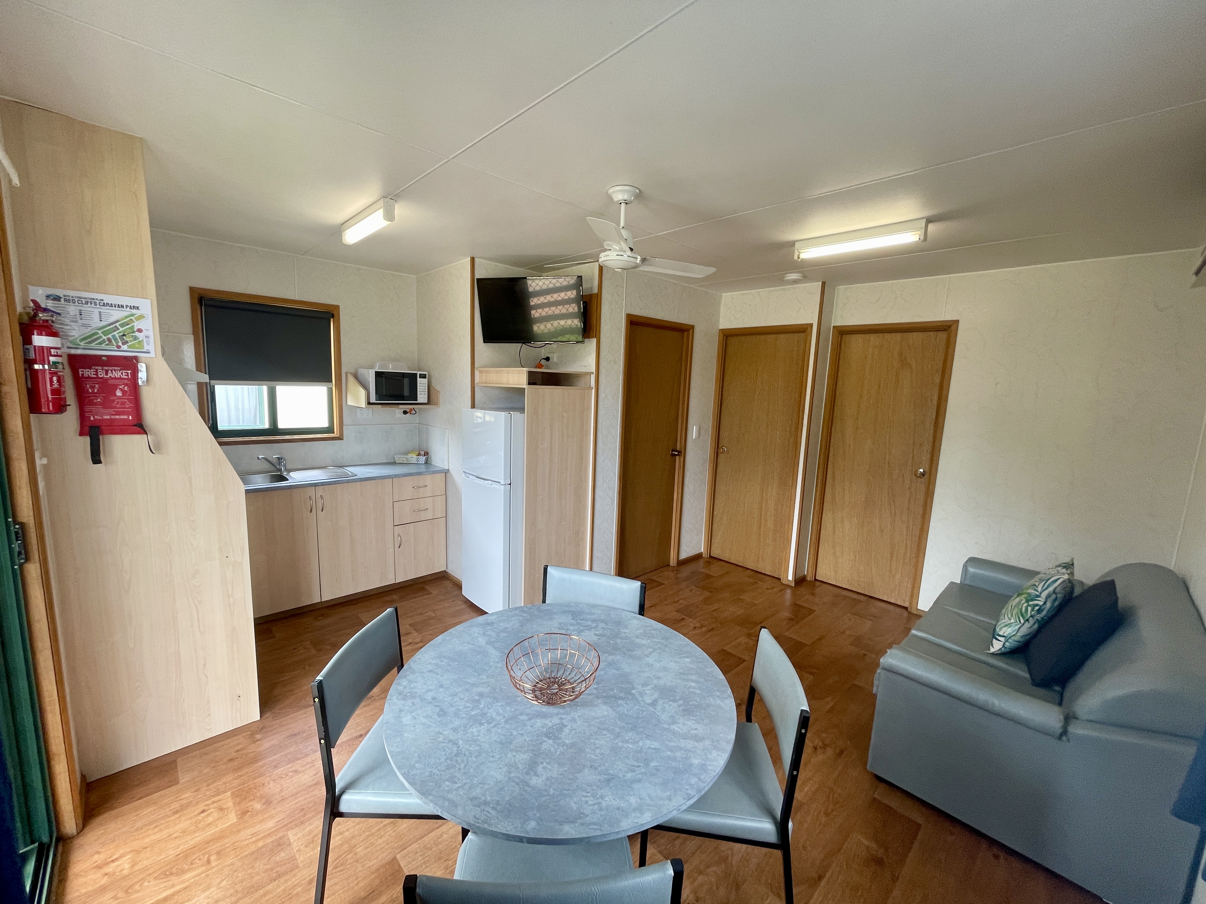 They feature 2 bedrooms, with a queen in one room along with flat screen TV & two sets of bunks in the other. All Linen is supplied & reverse cycle for your comfort. Our Superior Cabins are located not far from the pool & playground areas.