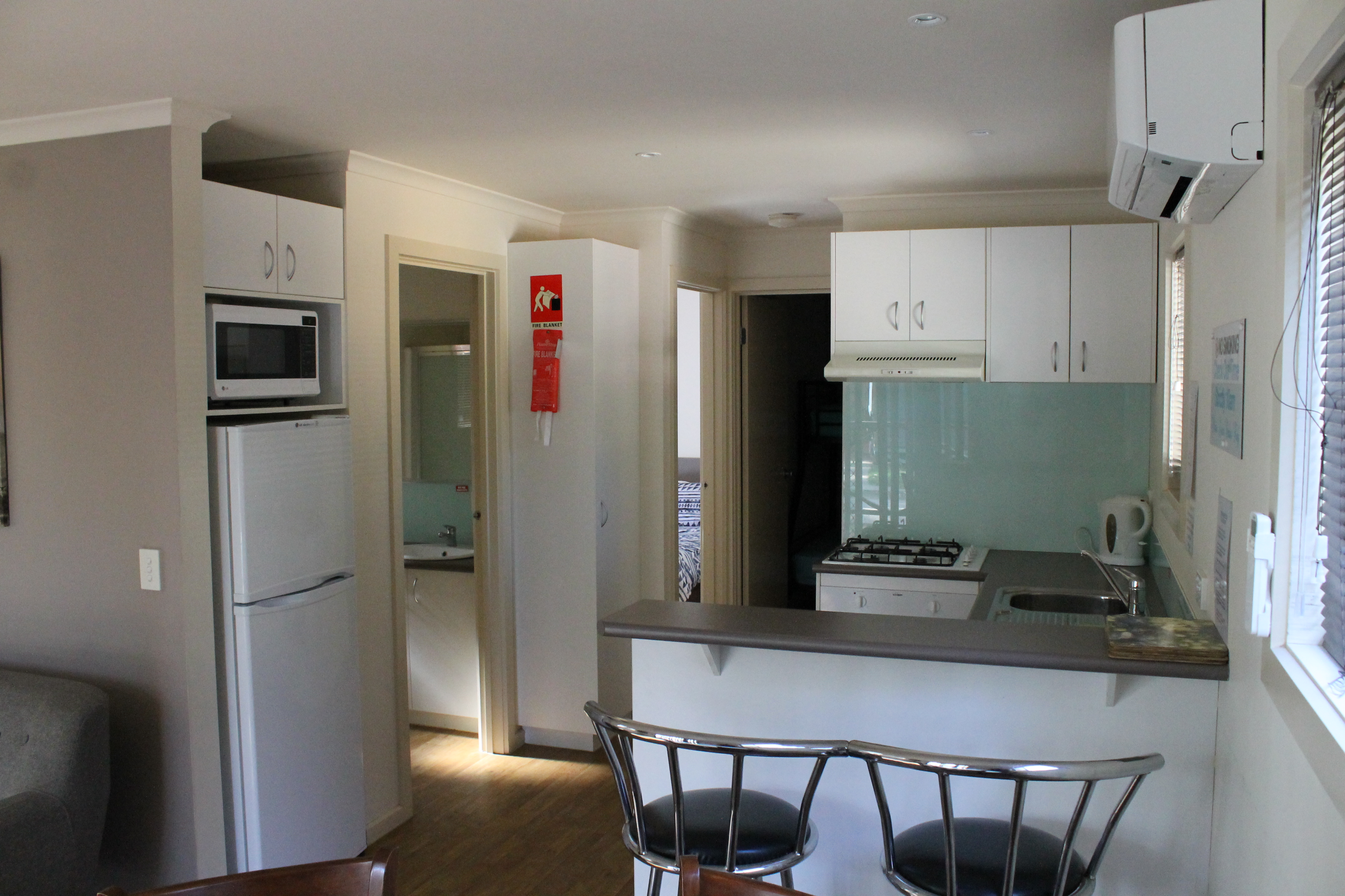 Our Southern Cross Ensuite Cabins are situated near the swimming pool and large grassed play area within walking distance to the Murray River. The cabin is fully self-contained with kitchen, ensuite with shower/toilet, 32” TV, a 3 seater couch and reverses cycle air conditioning for your comfort. The fully equipped kitchen comprises of a full sized oven/cooker, microwave and 220lt refrigerator.
