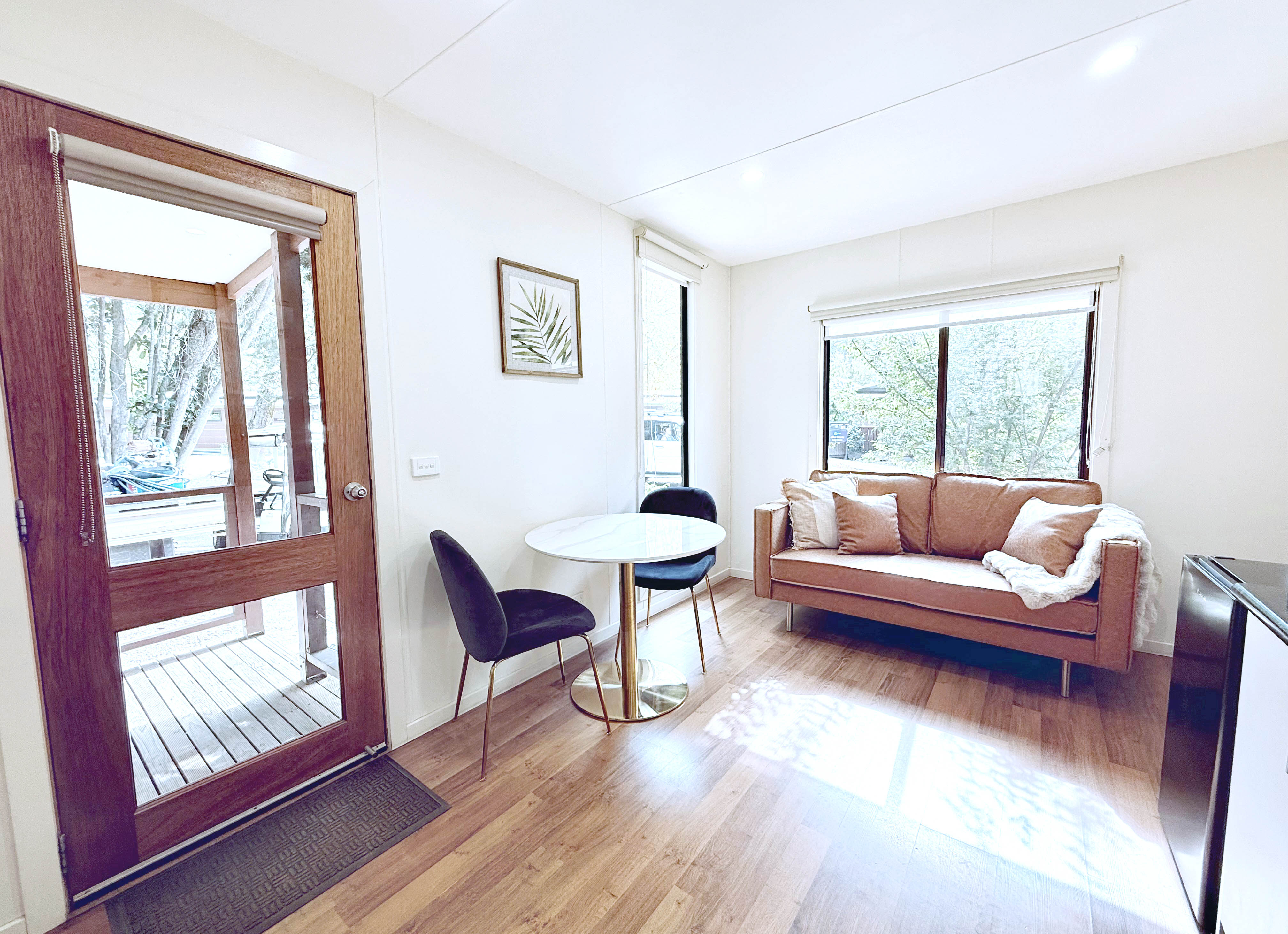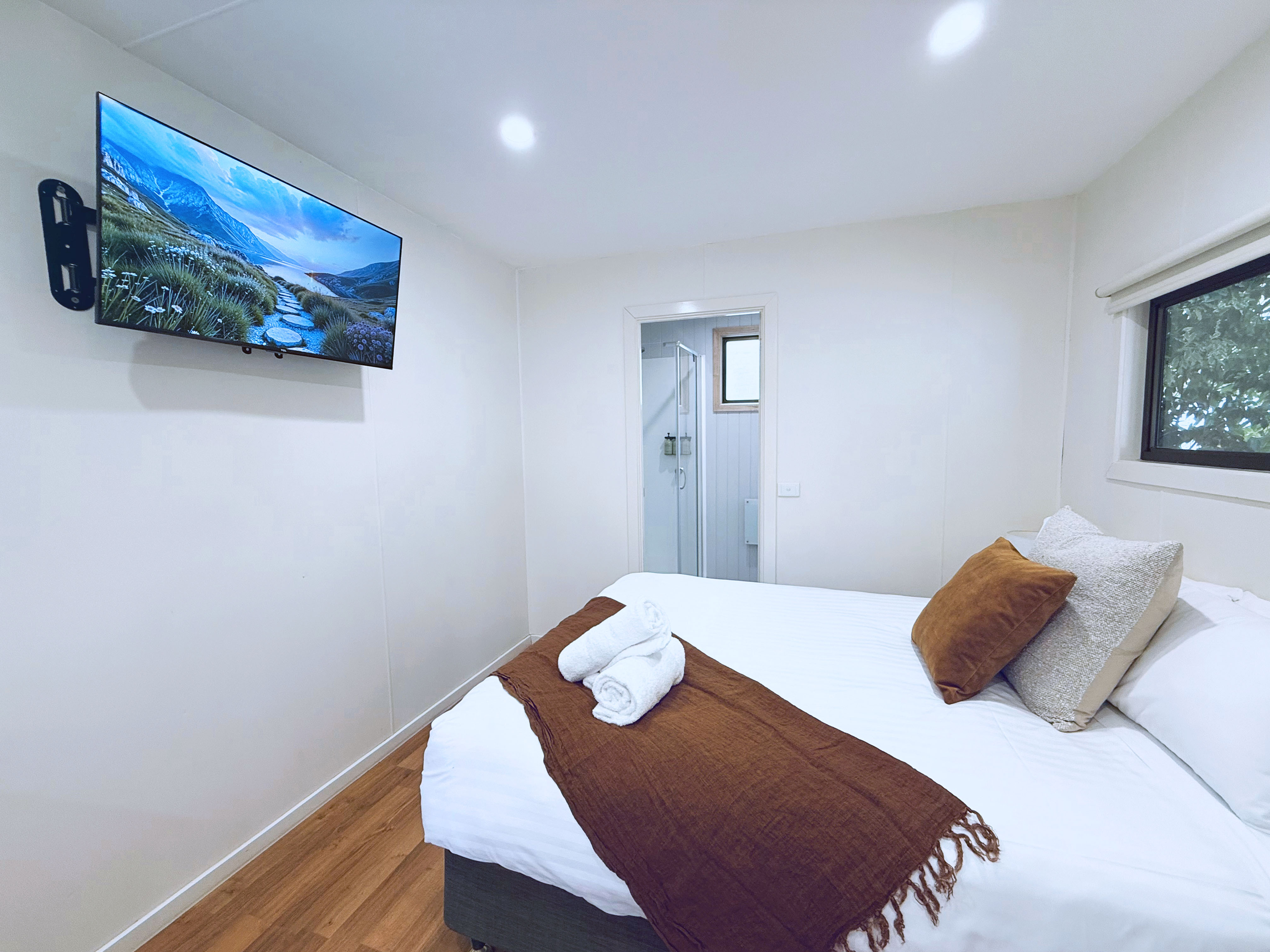 Climate controlled all year round, our Budget Cabin offers an open plan environment featuring living area with lounge, dining and a fully equipped kitchen. The kitchen includes a fridge/freezer, microwave and gas cooktop, plus a toaster, kettle and complimentary tea, coffee and sugar. The sleep zone area features a comfortable double-sized bed. The bathroom includes a shower and toilet with complimentary shampoo, conditioner and body wash.