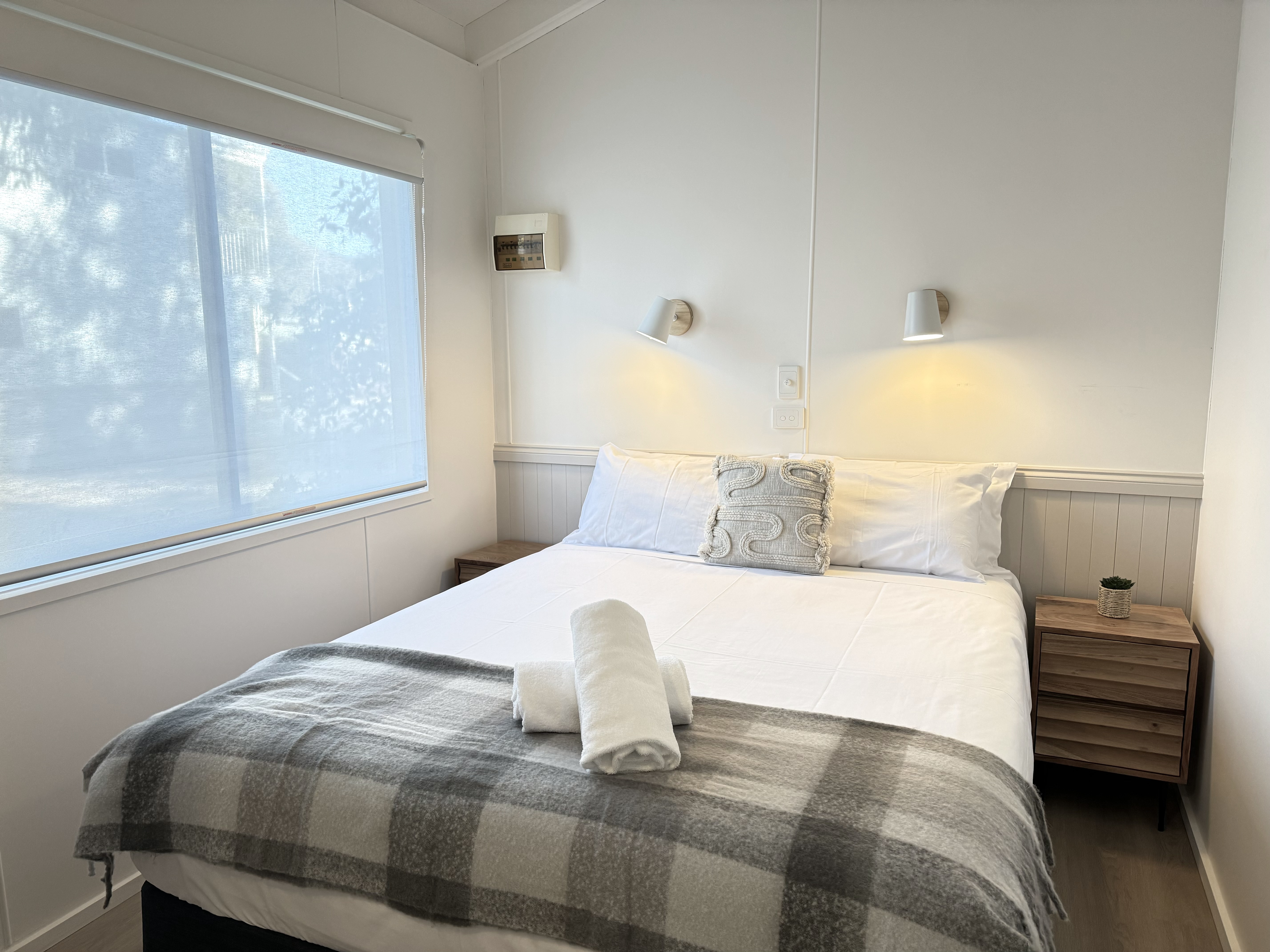 Climate controlled all year round, our Three Bedroom Villas offer a spacious and open plan living area with lounge, dining and a fully equipped kitchen. The kitchen features a large fridge/freezer, microwave and gas cooktop with oven, plus a toaster, kettle, and complimentary tea, coffee and sugar. The main bedroom features a queen-sized bed, the second bedroom contains two single beds, and the third bedroom two sets of bunks (we do not recommend adults stay in the bunk beds, due to size and comfort). The bathroom features a shower with complimentary shampoo, conditioner and body wash, and there's a separate toilet and laundry facilities located in the Villa.