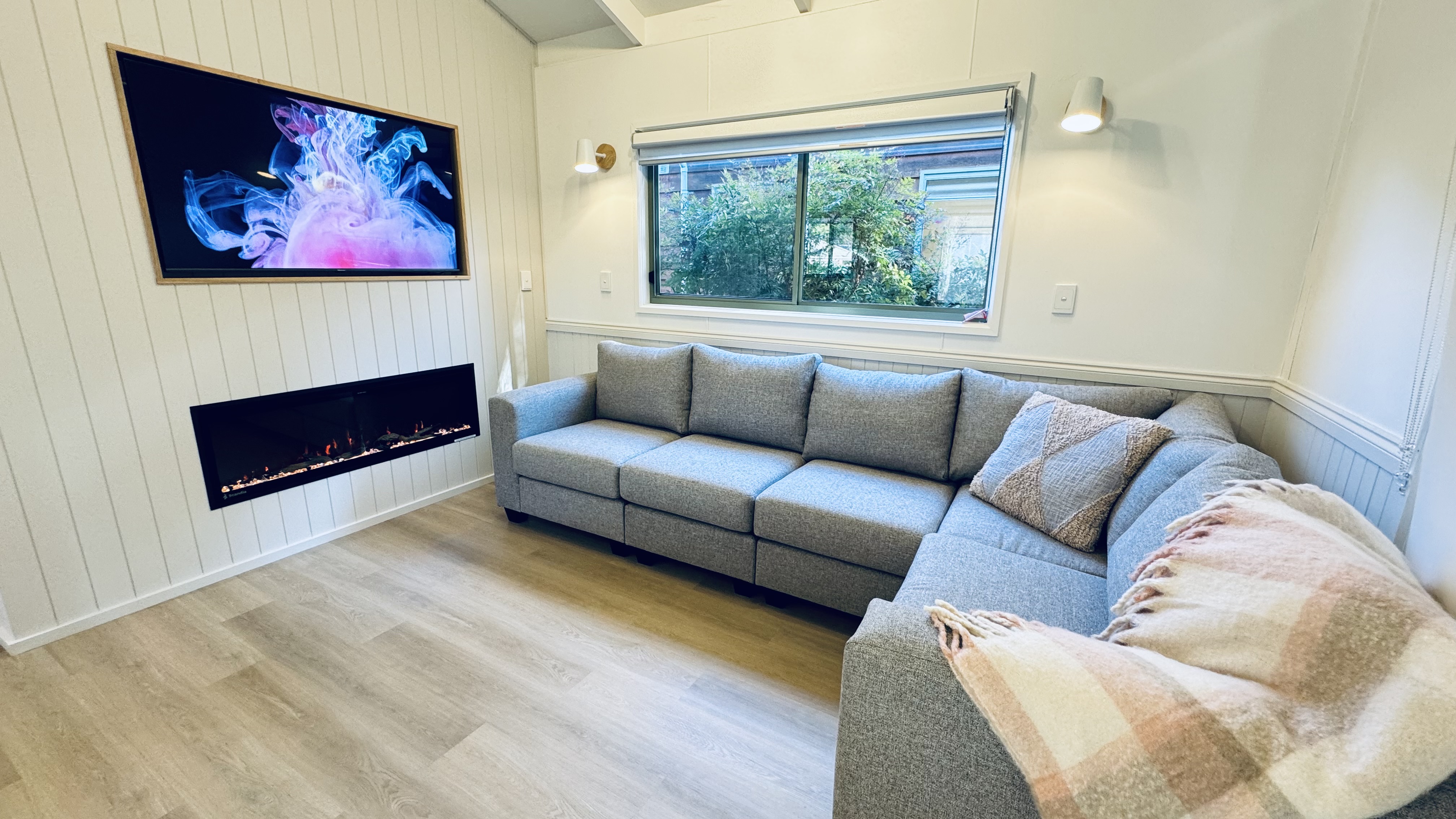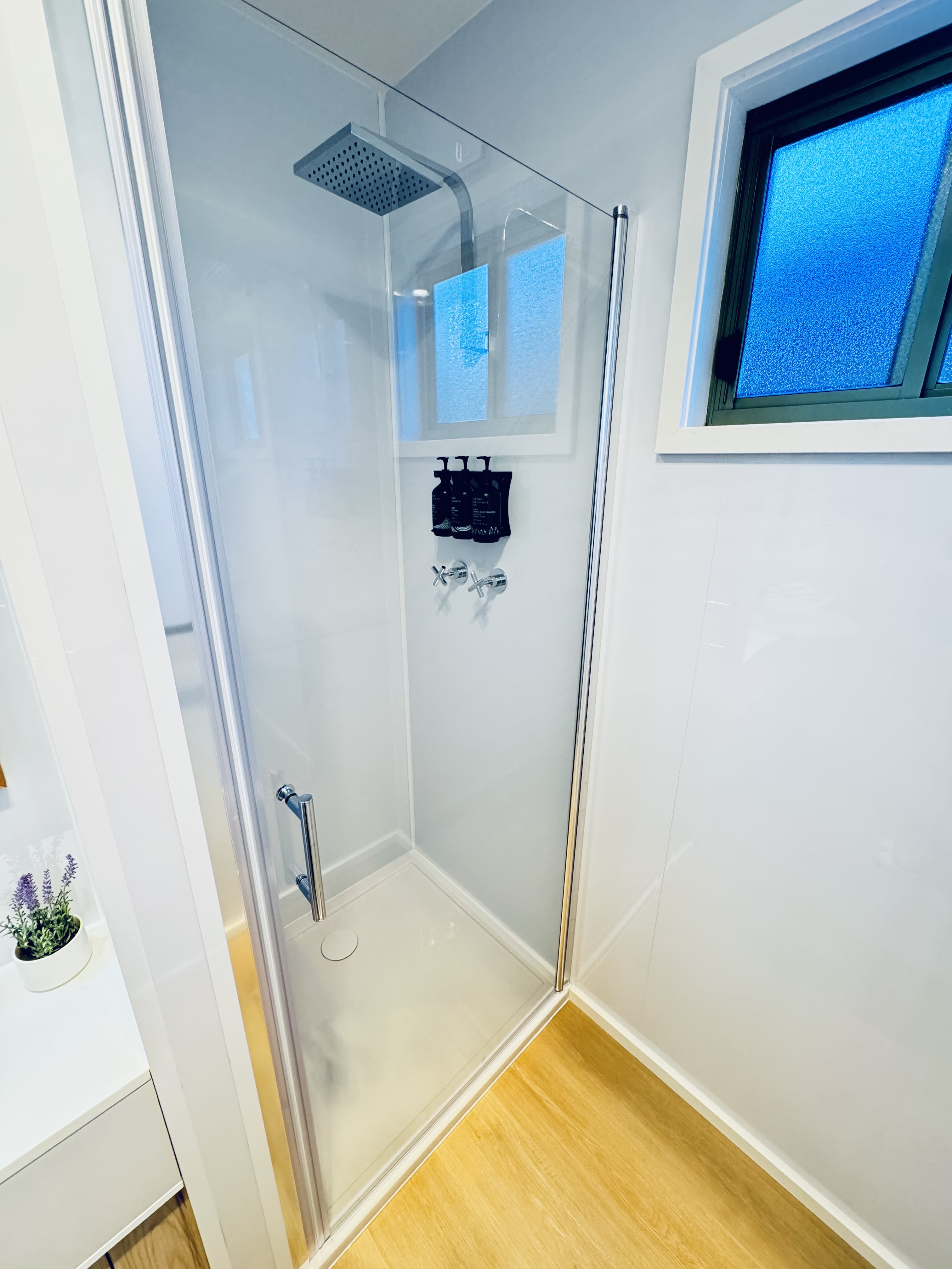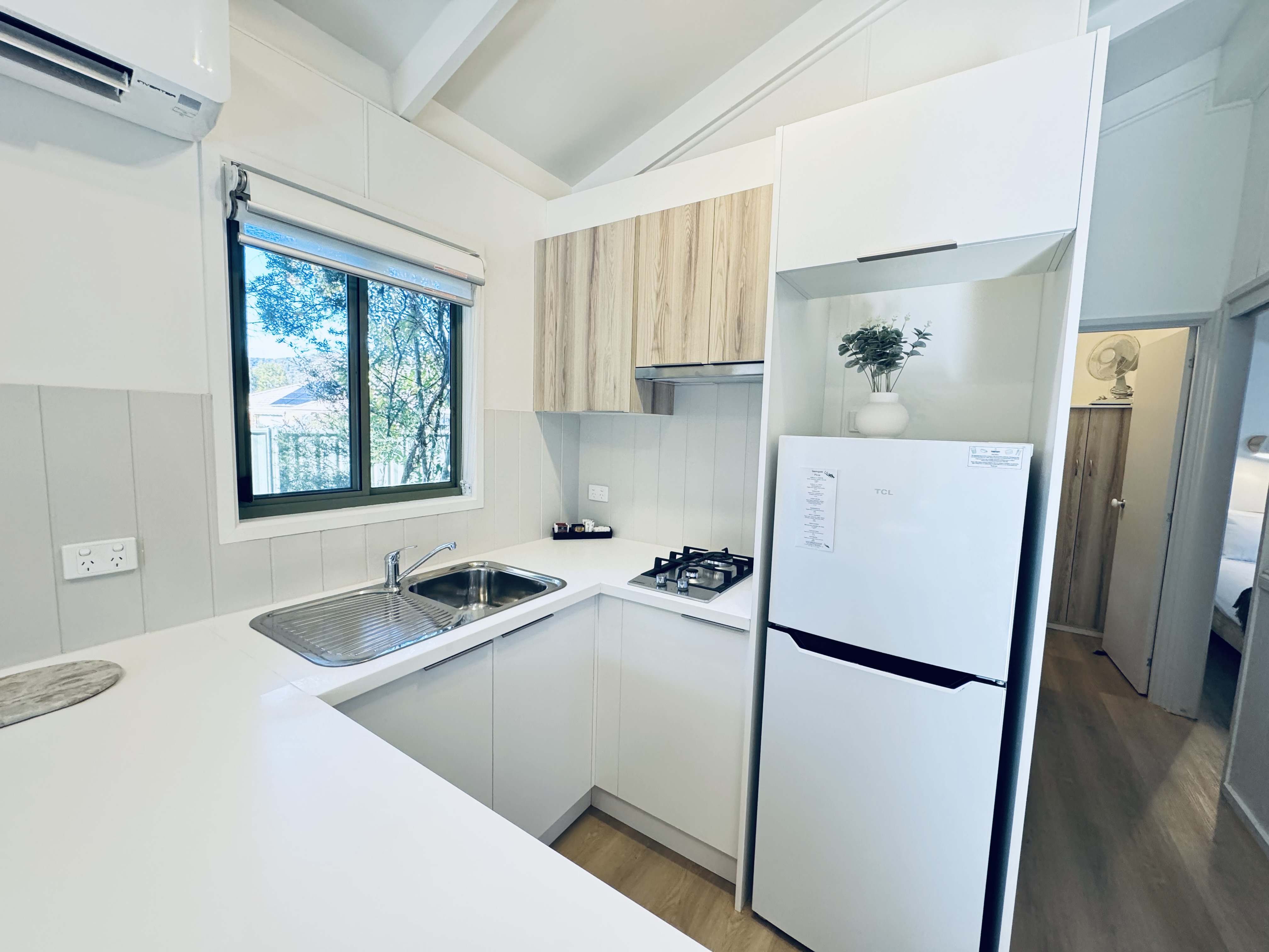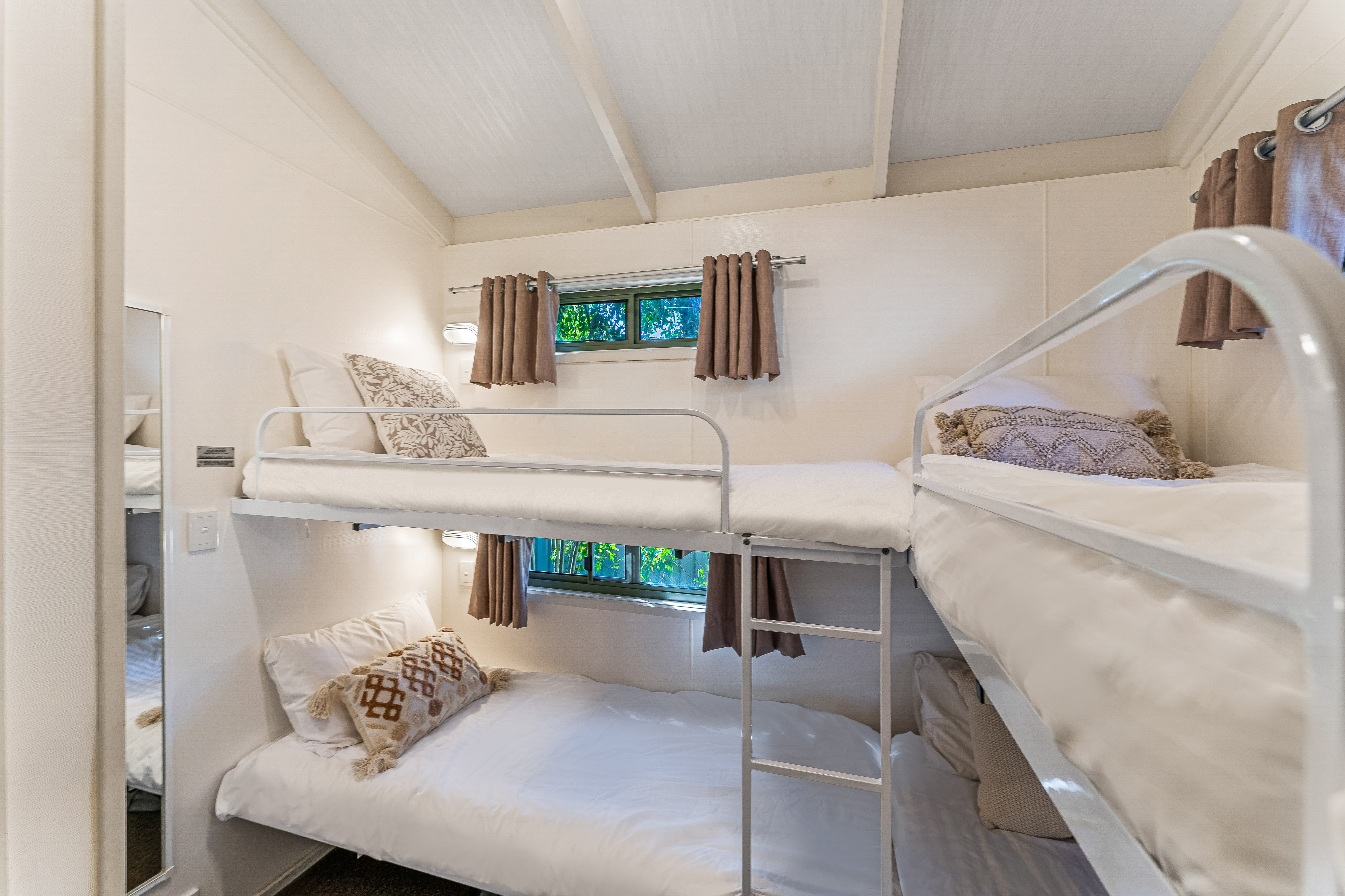 Climate controlled all year round, our Two Bedroom Villas offer a spacious and open plan living area with lounge, dining and a fully equipped kitchen featuring a large fridge/freezer, microwave and gas cooktop with oven, plus toaster, kettle and complimentary tea, coffee and sugar. The main bedroom features a queen-sized bed, whilst the second bedroom consists of two sets of bunks (we do not recommend adults stay in the bunk beds, due to size and comfort). The bathroom features a shower with complimentary shampoo, conditioner and body wash, and there's a separate toilet.