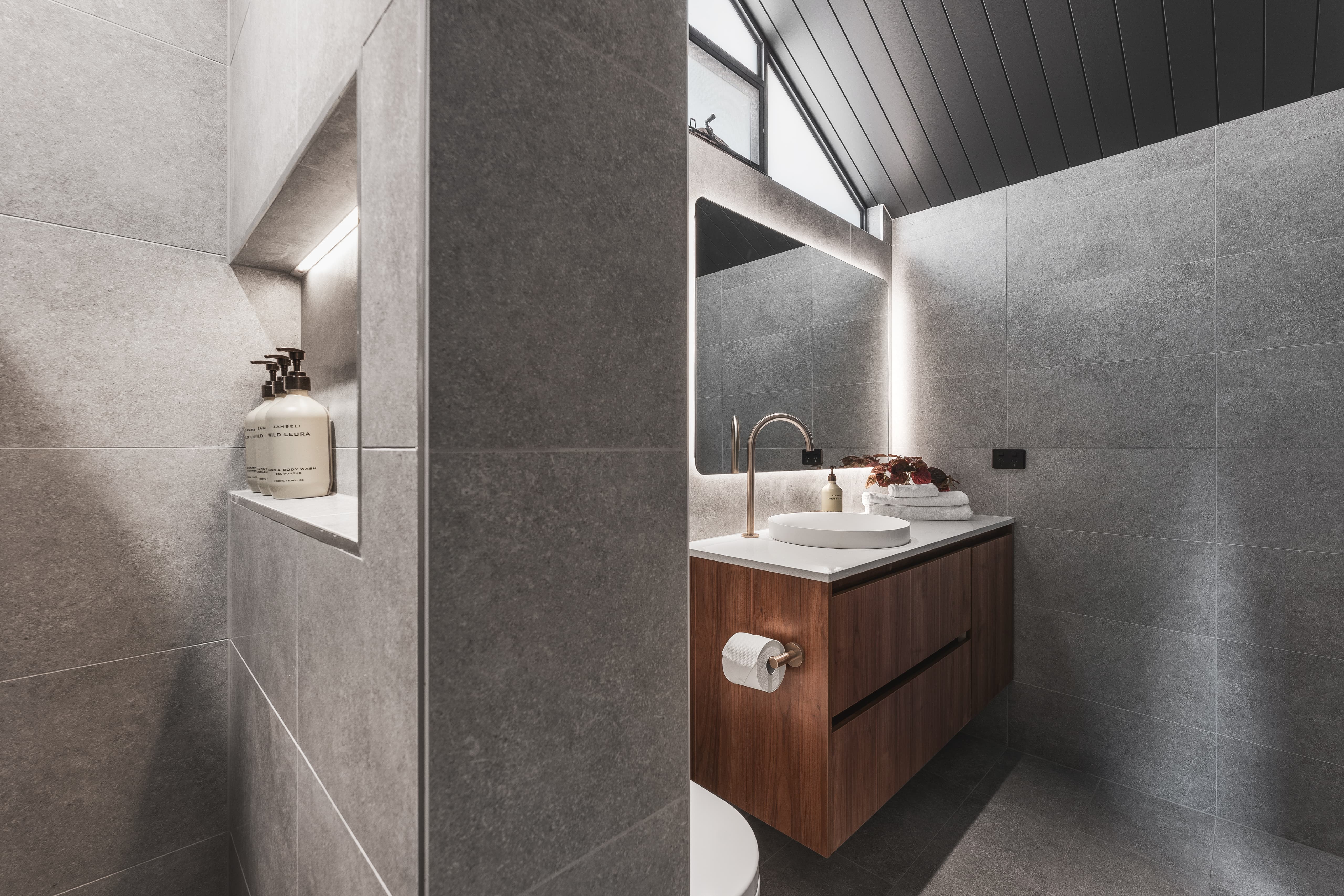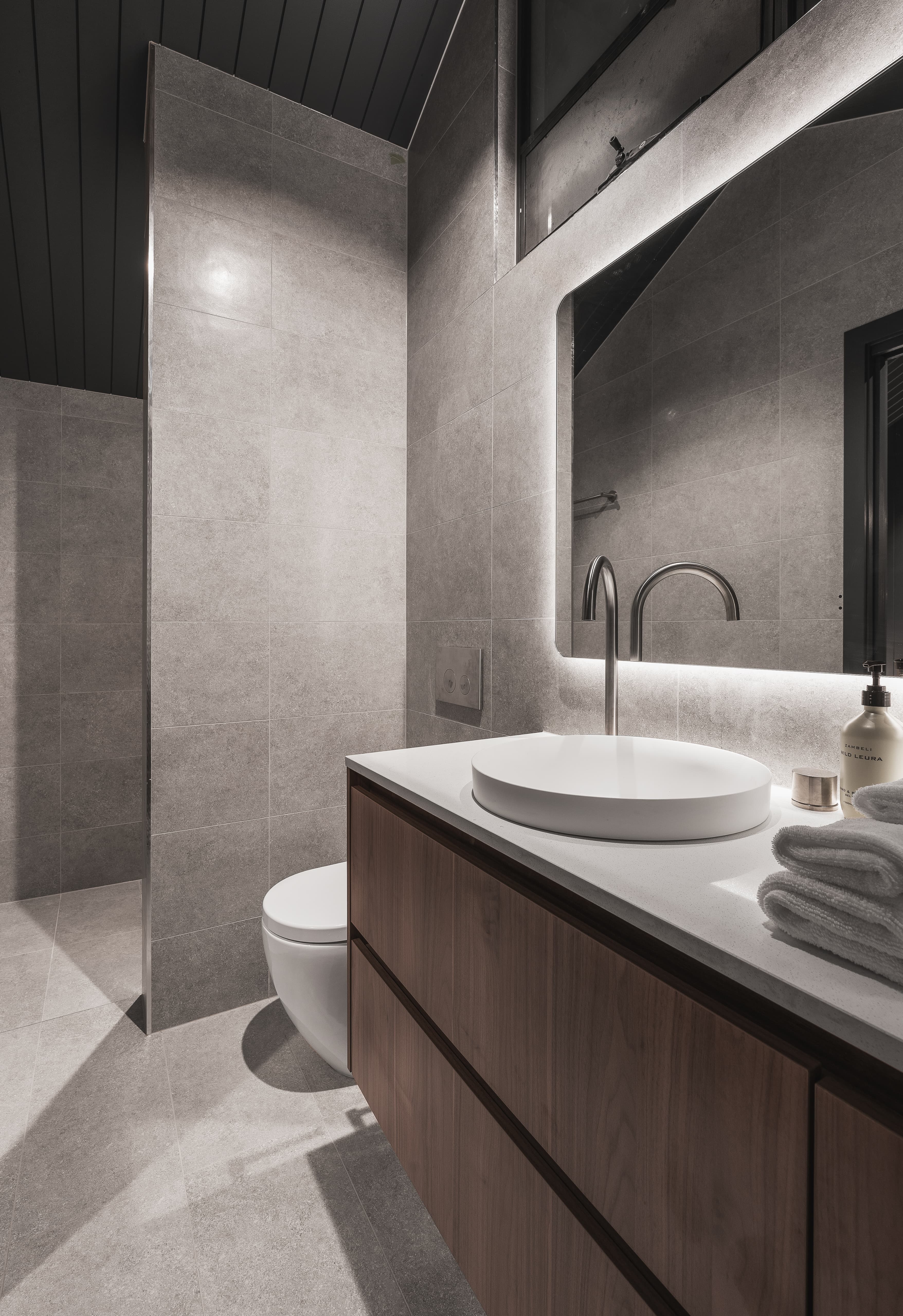 With dark, moody interiors and luxe furnishings, the open-plan lounge and dining area features a cosy fireplace, creating the ideal ambiance for relaxation.