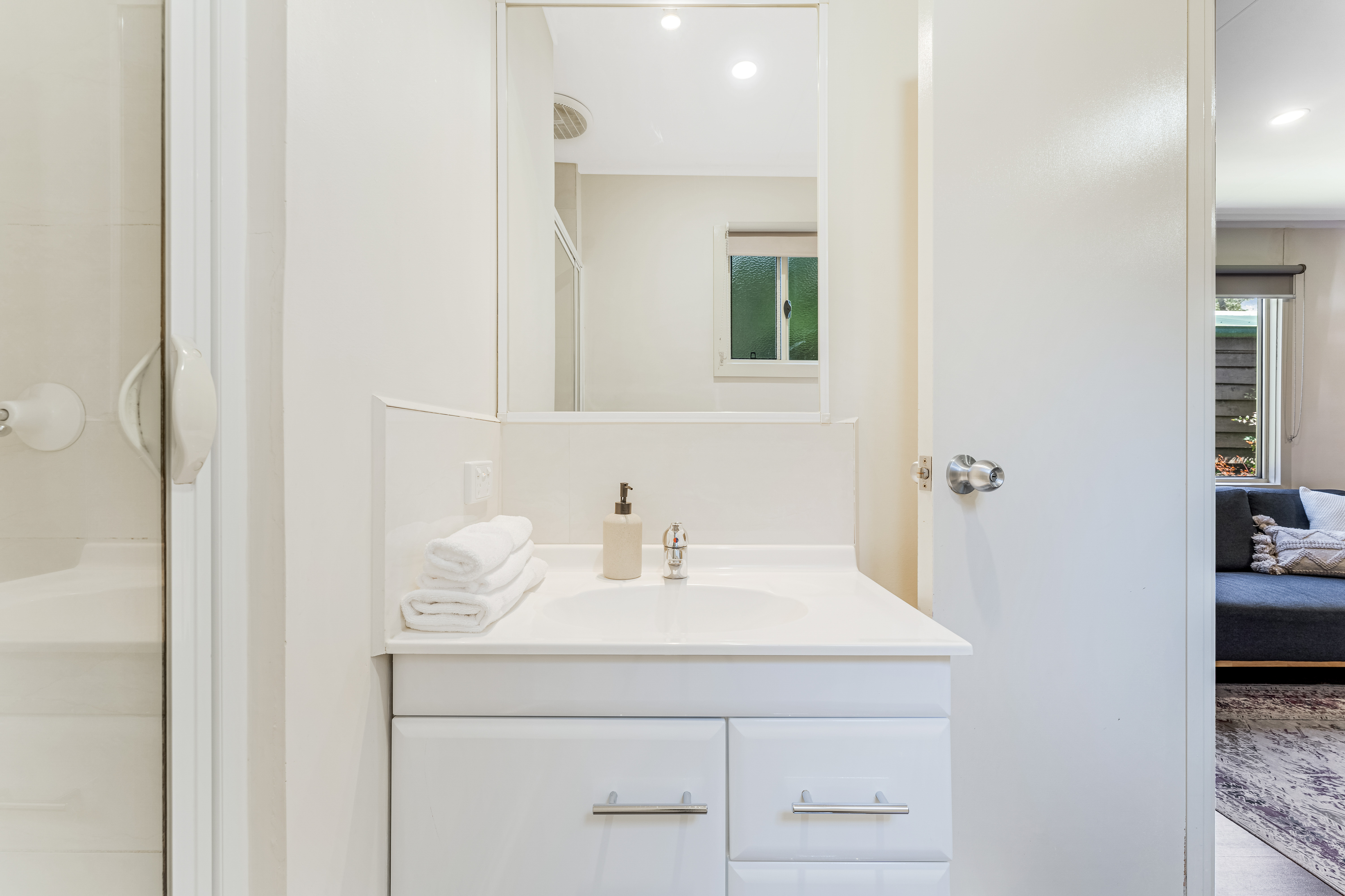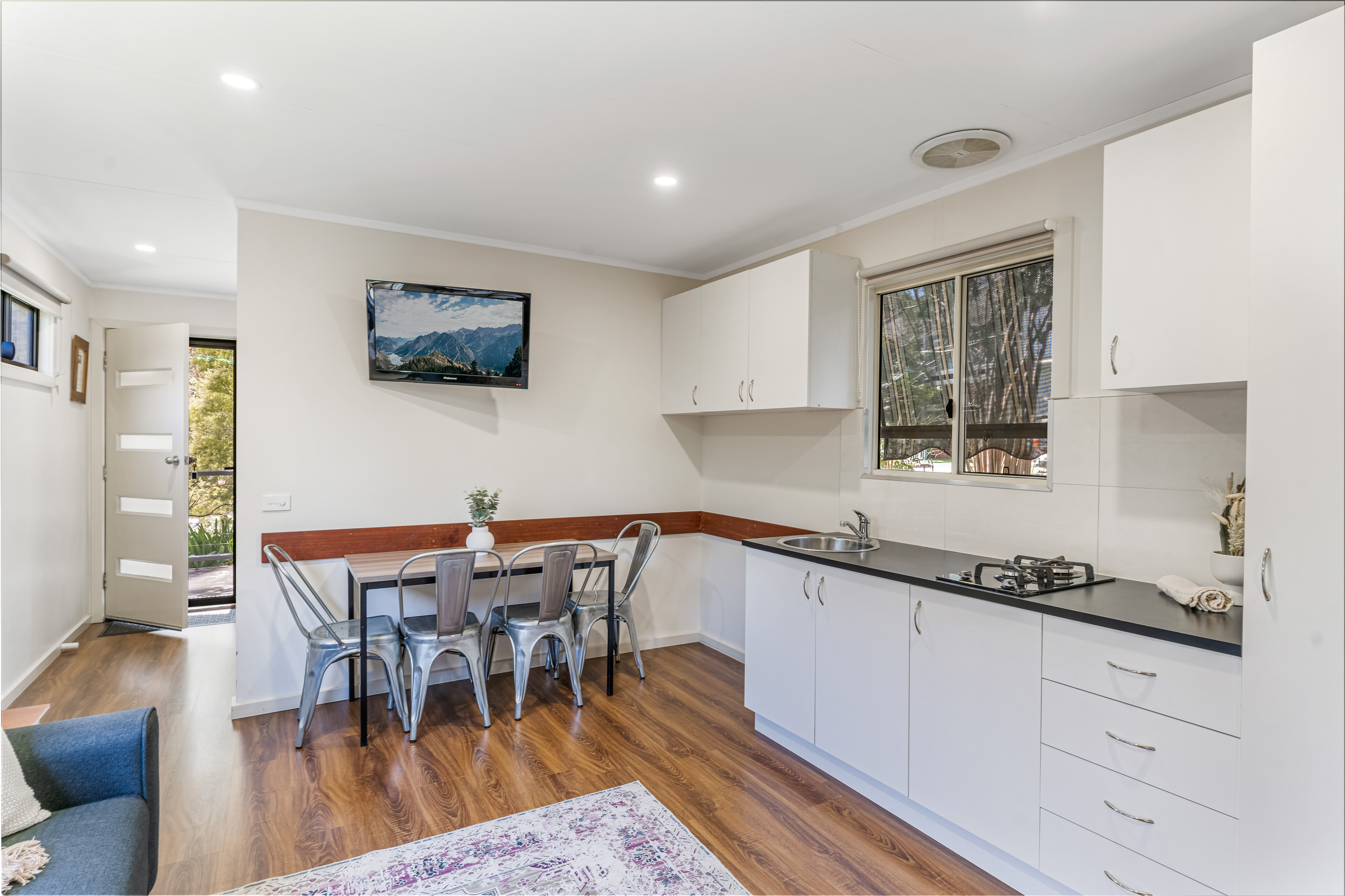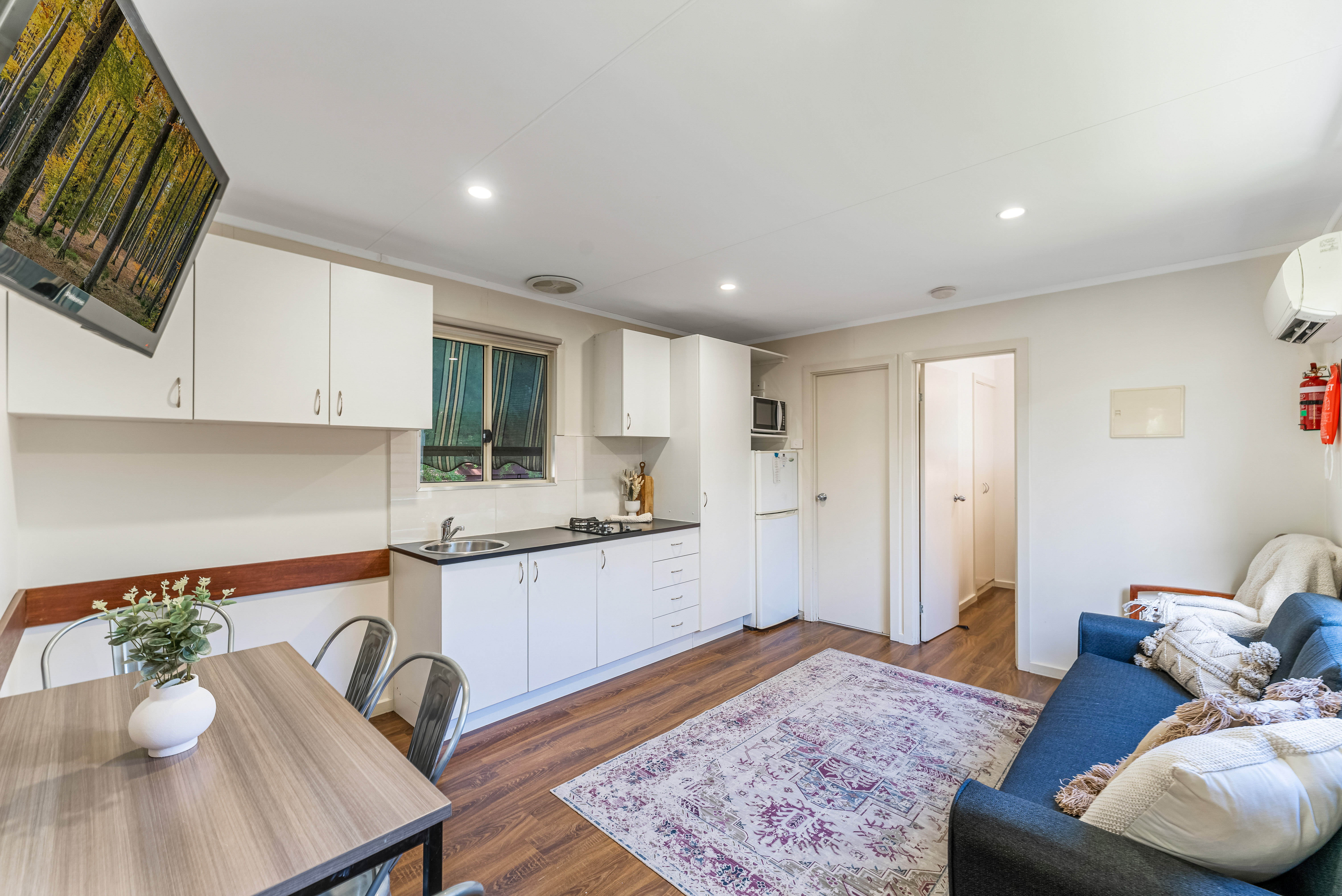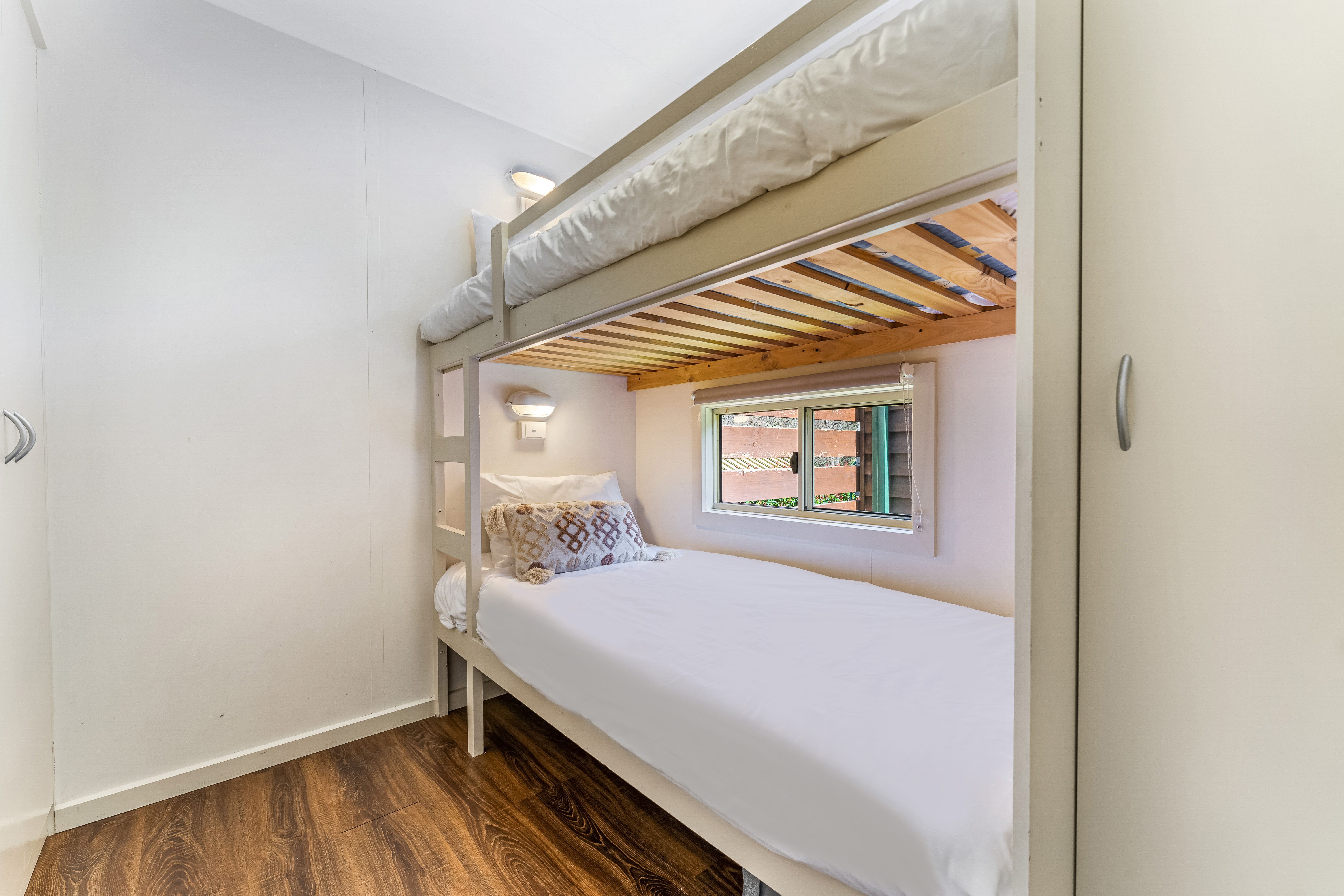 Climate controlled all year round, our Cabins offer an open plan living area with lounge, dining and a fully equipped kitchen featuring a large fridge/freezer, microwave and gas cooktop, plus a toaster, kettle and complimentary tea, coffee and sugar. The main sleeping zone features a queen-sized bed with an open walkway through to the living/dining area. The second bedroom consists of a set of bunks (we do not recommend adults stay in the bunk beds, due to size and comfort). The bathroom features a shower, toilet and complimentary shampoo, conditioner and body wash.