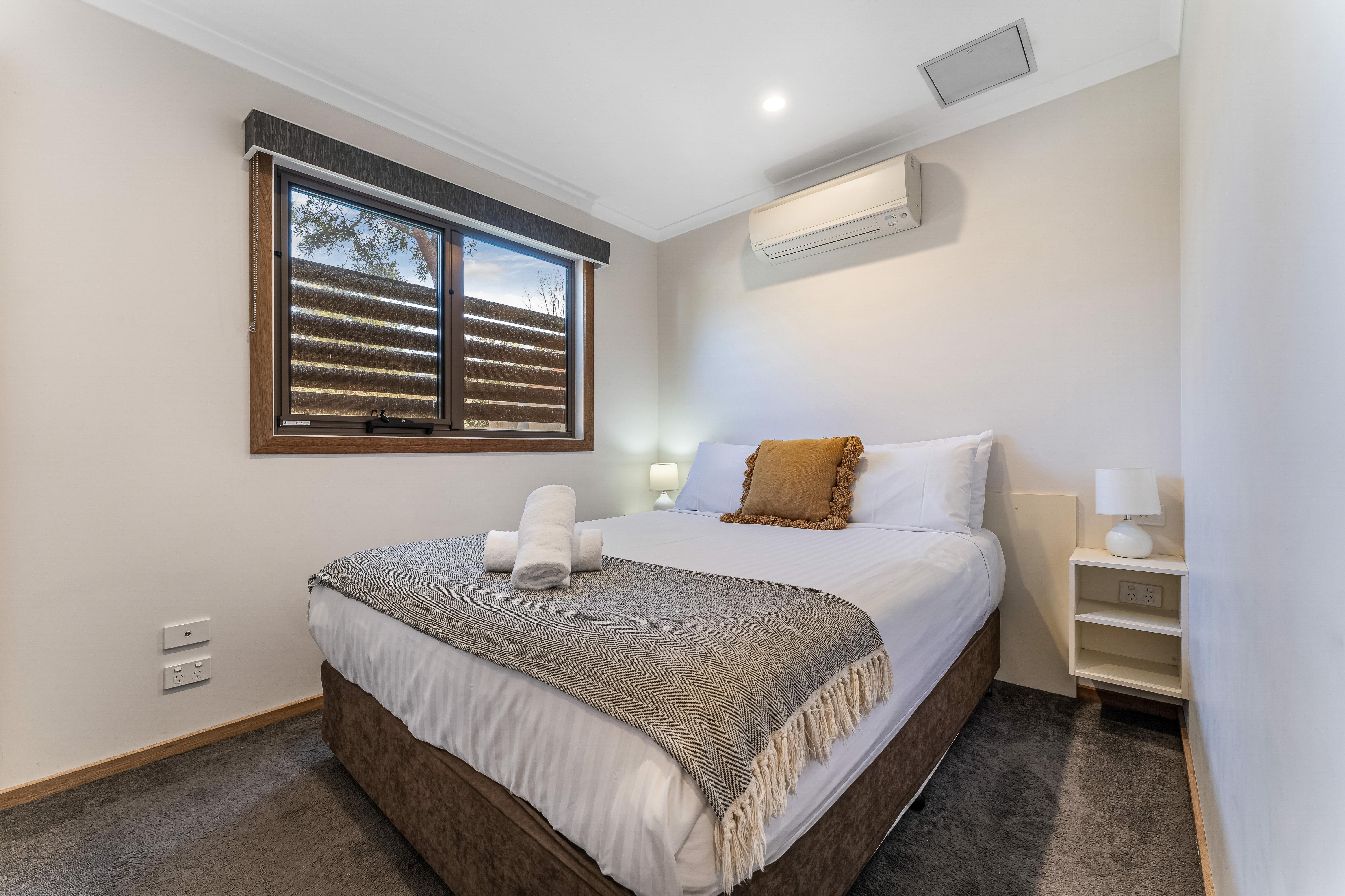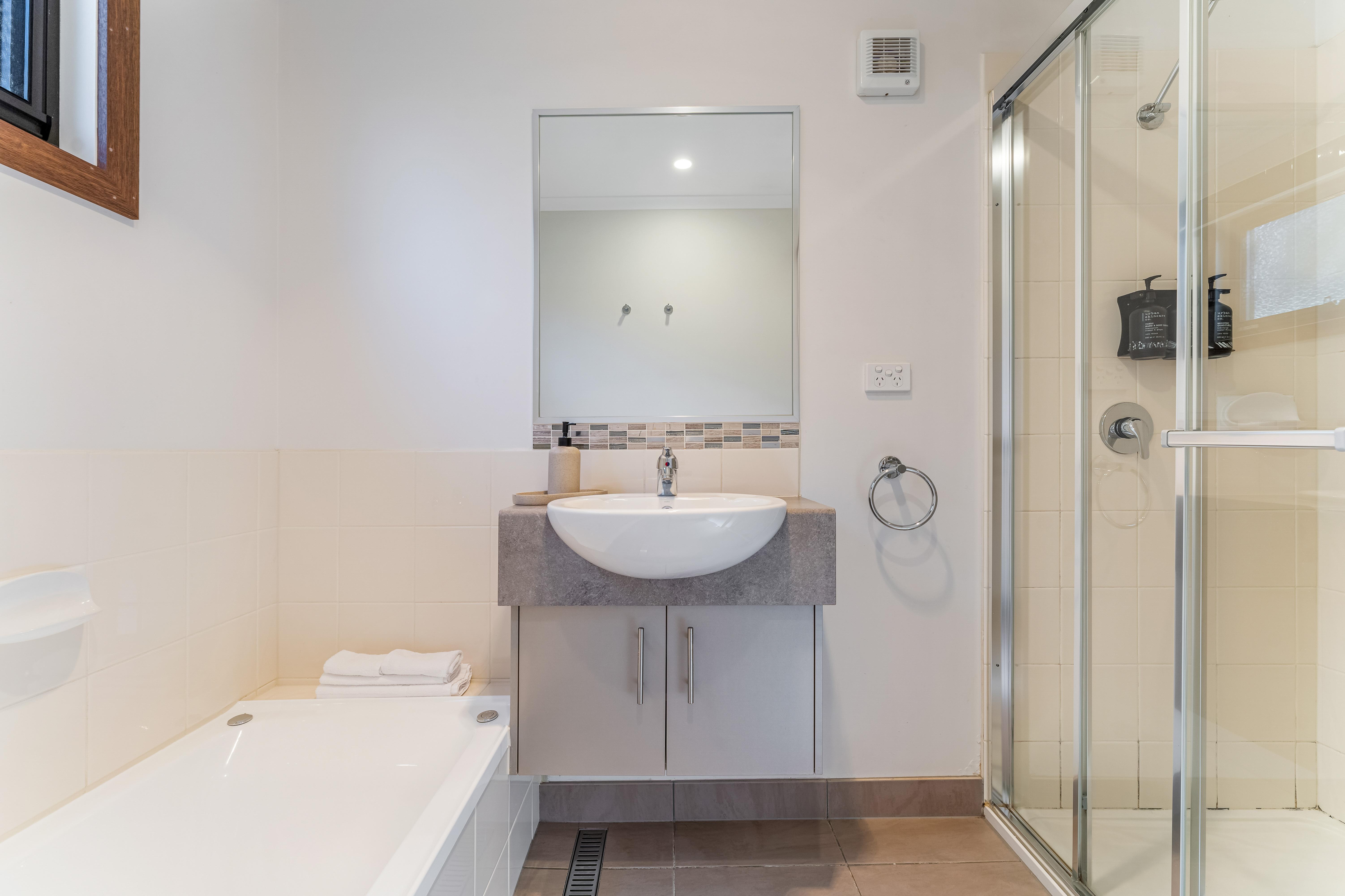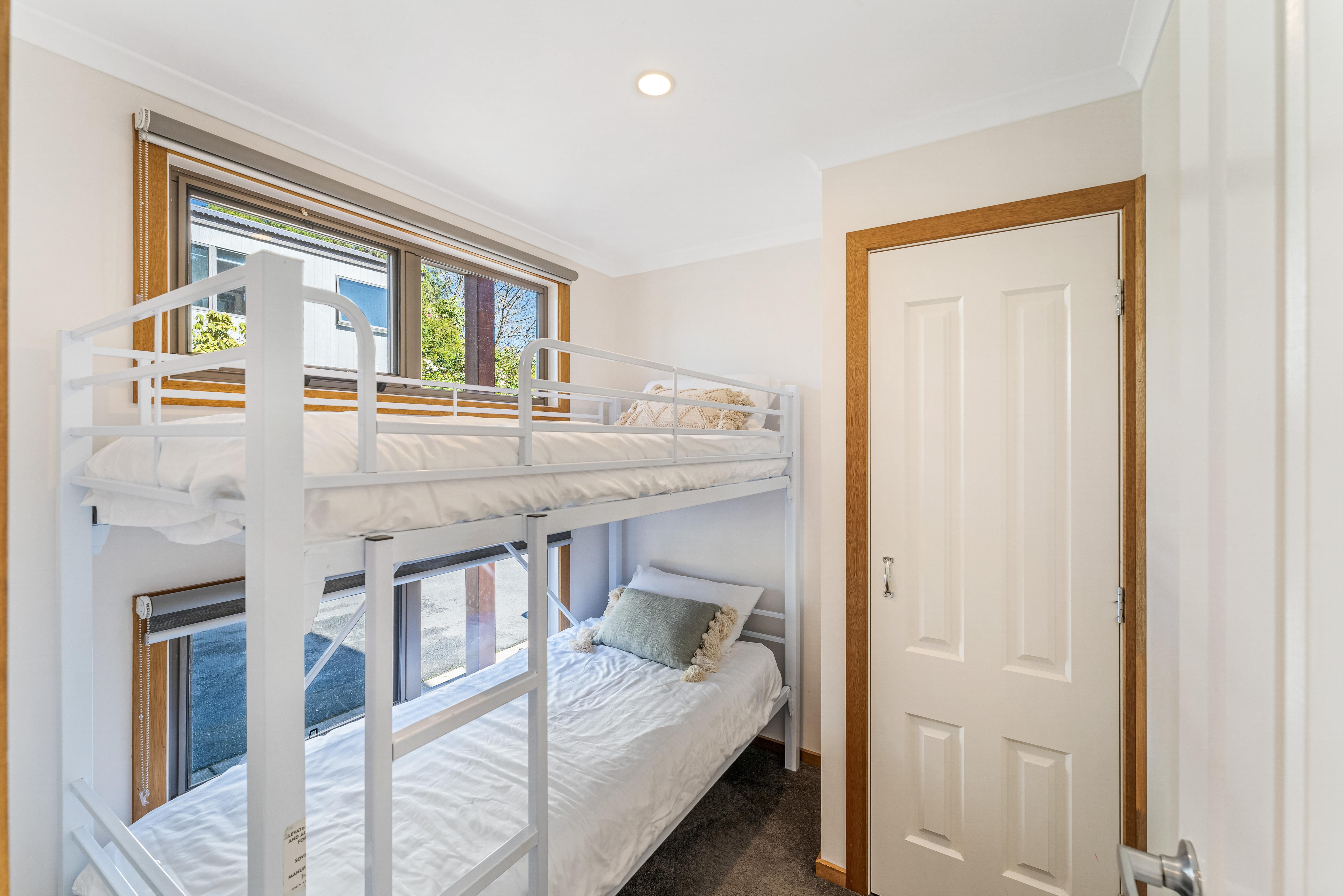 Climate controlled all year round and split over two levels, the first level features the three bedrooms and main bathroom with a shower, wonderful spa bath, hair dryer and complimentary shampoo, conditioned, and body wash. The main bedroom includes a queen size bed, the second bedroom contains two single beds, and the third bedroom consists of a set of bunks (we do not recommend adults stay in the bunk beds, due to size and comfort). The second level provides a spacious and open plan living area, with dining and lounge, and a fully equipped kitchen featuring a large fridge/freezer, microwave and gas cooktop with oven, plus complimentary tea, coffee and sugar. A powder room is also located upstairs for your convenience.