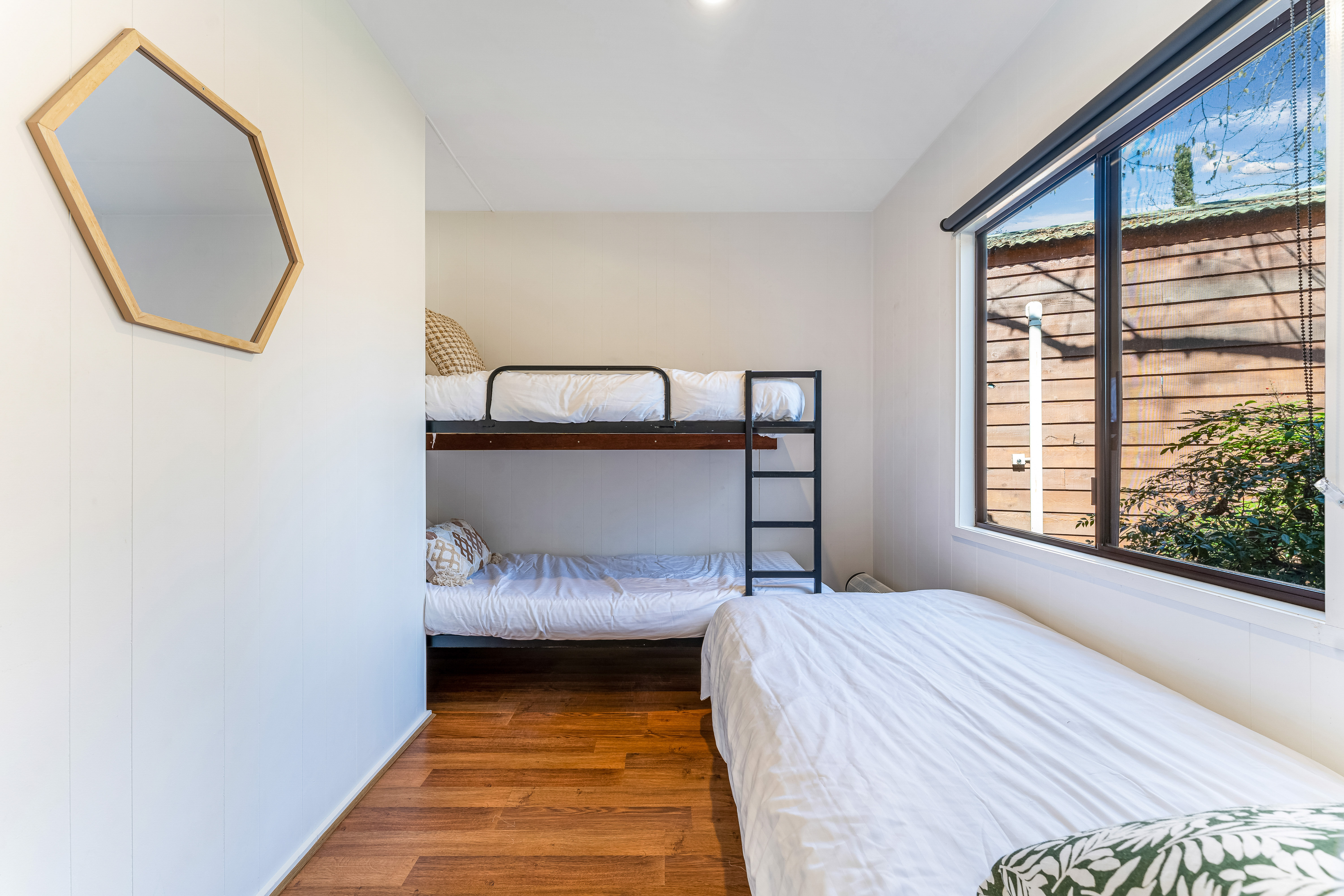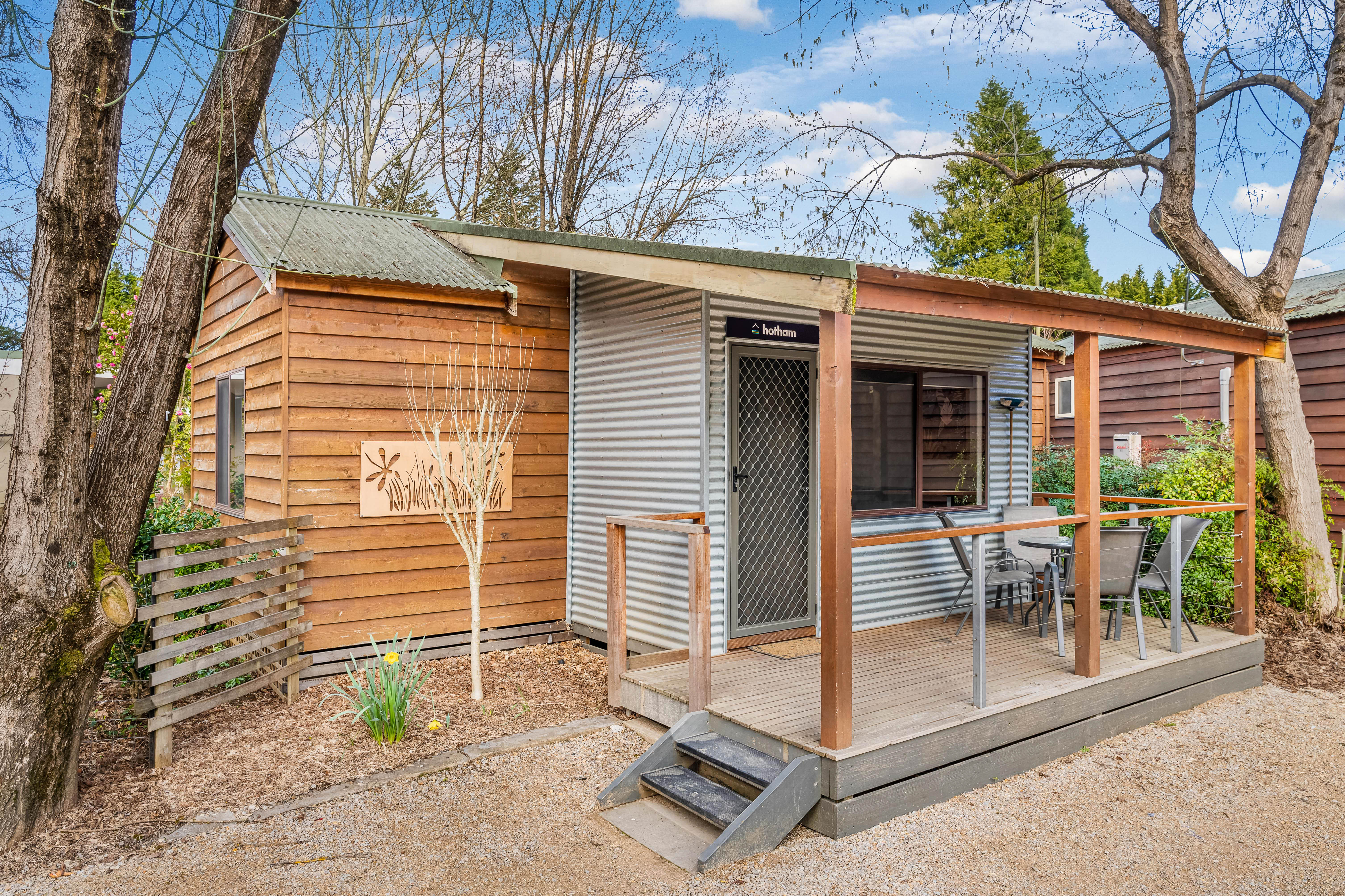 Climate controlled all year round, our Two Bedroom Cabin offers an open plan living area with lounge, dining and a fully equipped kitchen. The kitchen features a fridge/freezer, microwave, gas cooktop with oven and toaster, kettle and complimentary tea, coffee and sugar. Accommodating up to five guests, the main bedroom features a queen-sized bed, whilst the second bedroom features a set of bunks and a single bed. The bathroom features a shower, toilet, hairdryer, and complimentary shampoo, conditioner, and body wash.