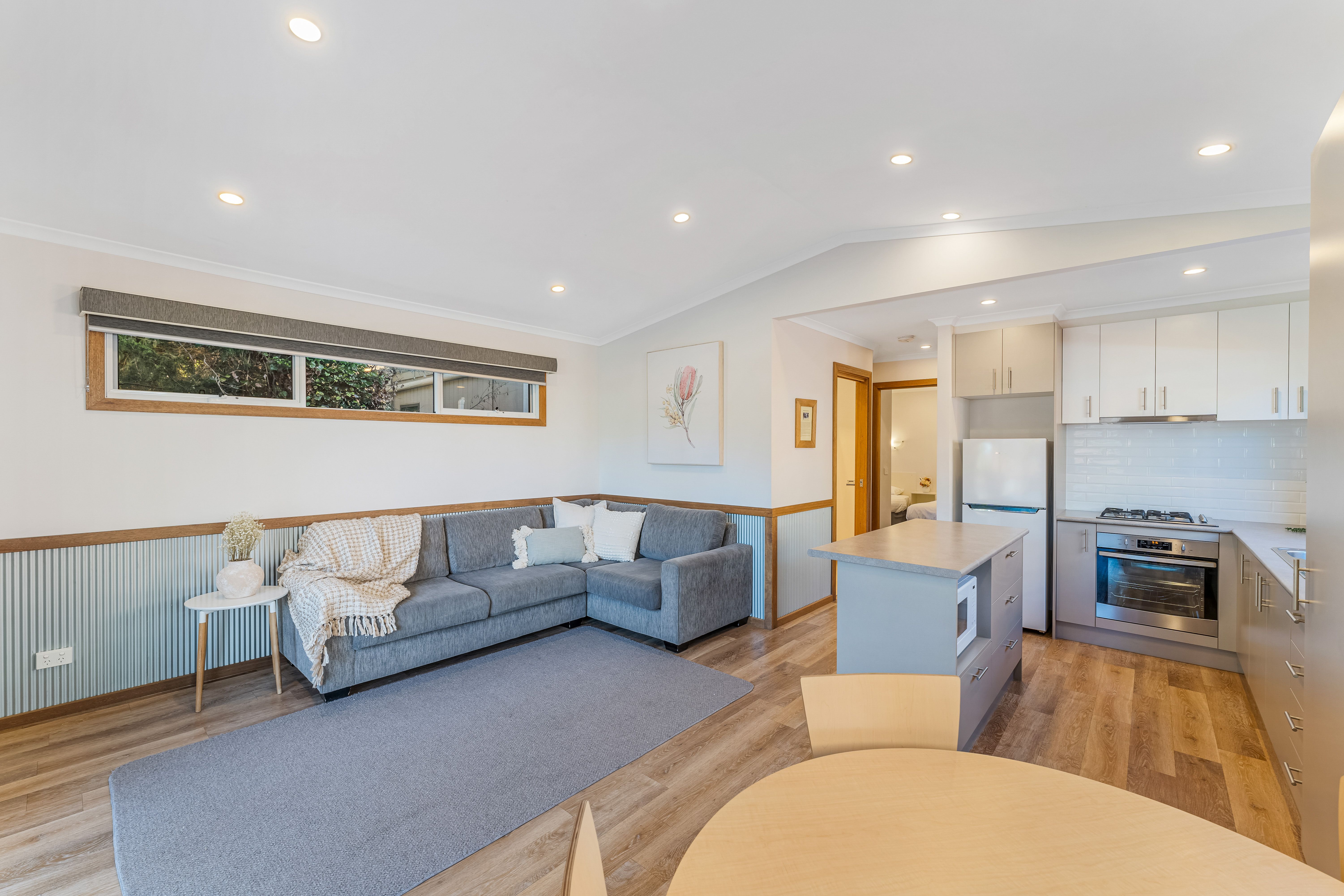 Climate controlled all year round, our villas offer a spacious and open plan living area with lounge, dining and a fully equipped kitchen, featuring a large fridge/freezer, microwave and gas cooktop with oven, plus a toaster, kettle and complimentary tea, coffee and sugar. The main bedroom features a queen-sized bed, whilst the second bedroom contains two single beds. The bathroom is well appointed and offers a separate shower and relaxing spa bath, plus complimentary shampoo, conditioner and body wash.