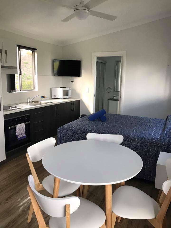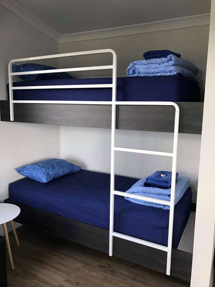 Brand new modern cabin with open plan area including a queen bed and set of bunks comfortably sleeping up to 4 people (2 adults and 2 children). Self-contained kitchen with dining area, lounge and ensuite. All cabins have reverse cycle air conditioning, TV and are conveniently located at the front of the park with close proximity to the Pool, Recreation Room and kids' activity area.