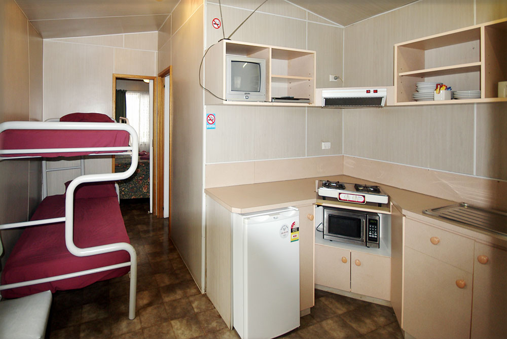 The One Bedroom Ensuite Cabin has various layouts: open plan with double bed & double bunks; double bed in bedroom & single bed in main room OR double bed in bedroom & double bunks in main room.