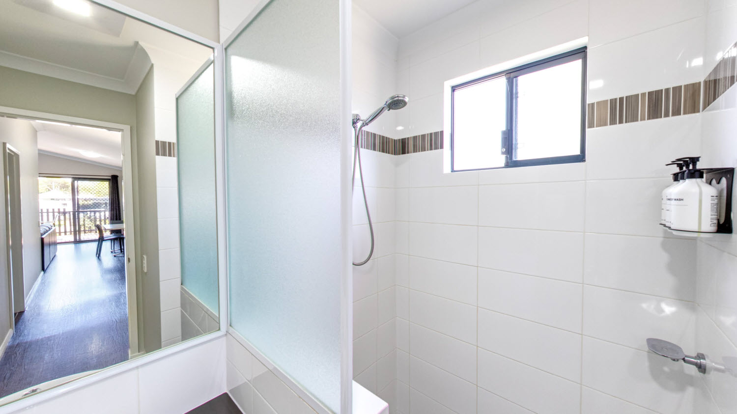 - Fully self-contained kitchen with crockery, cutlery, fridge, microwave and gas cook top
