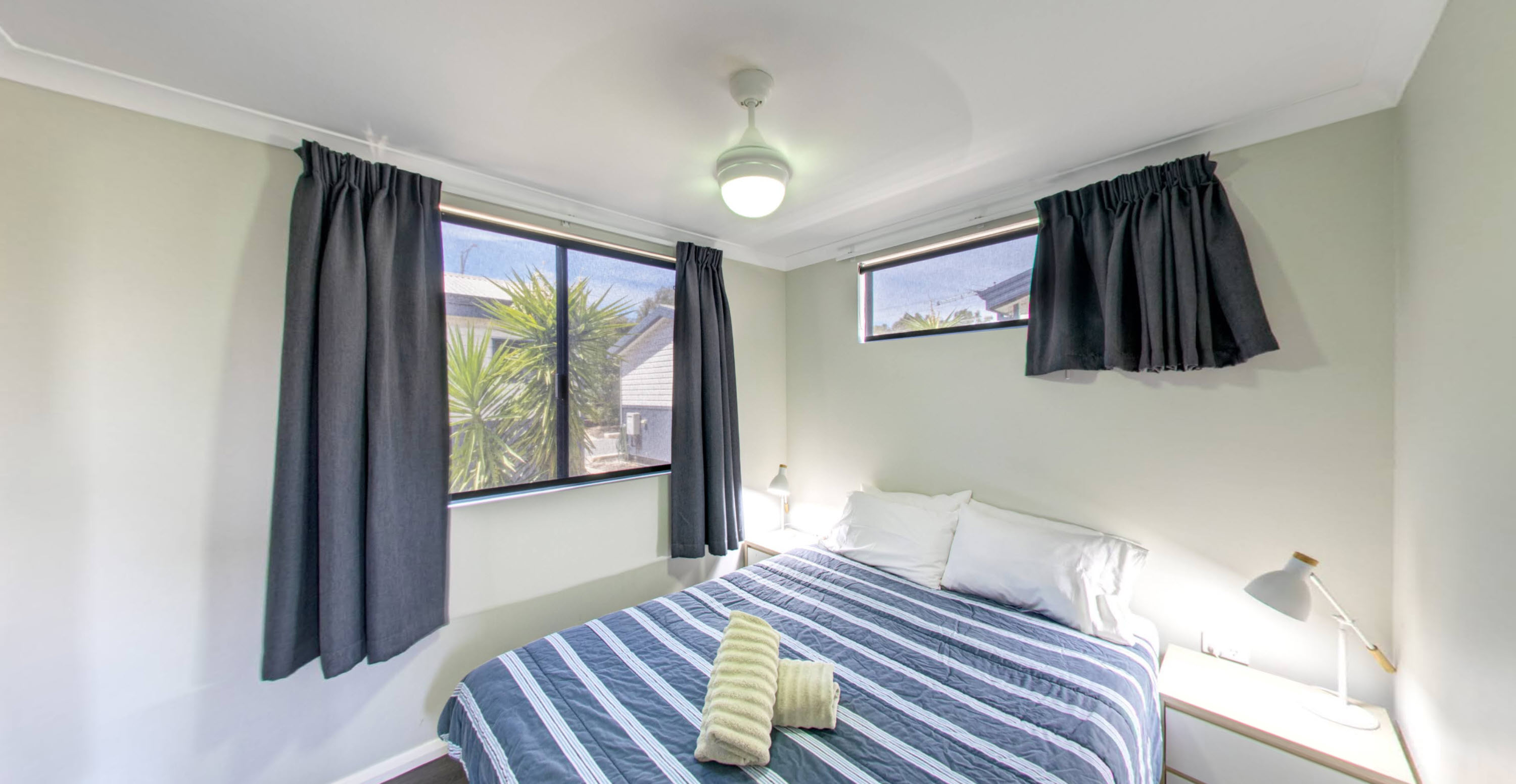 - Main bedroom has a queen bed and ceiling fans
