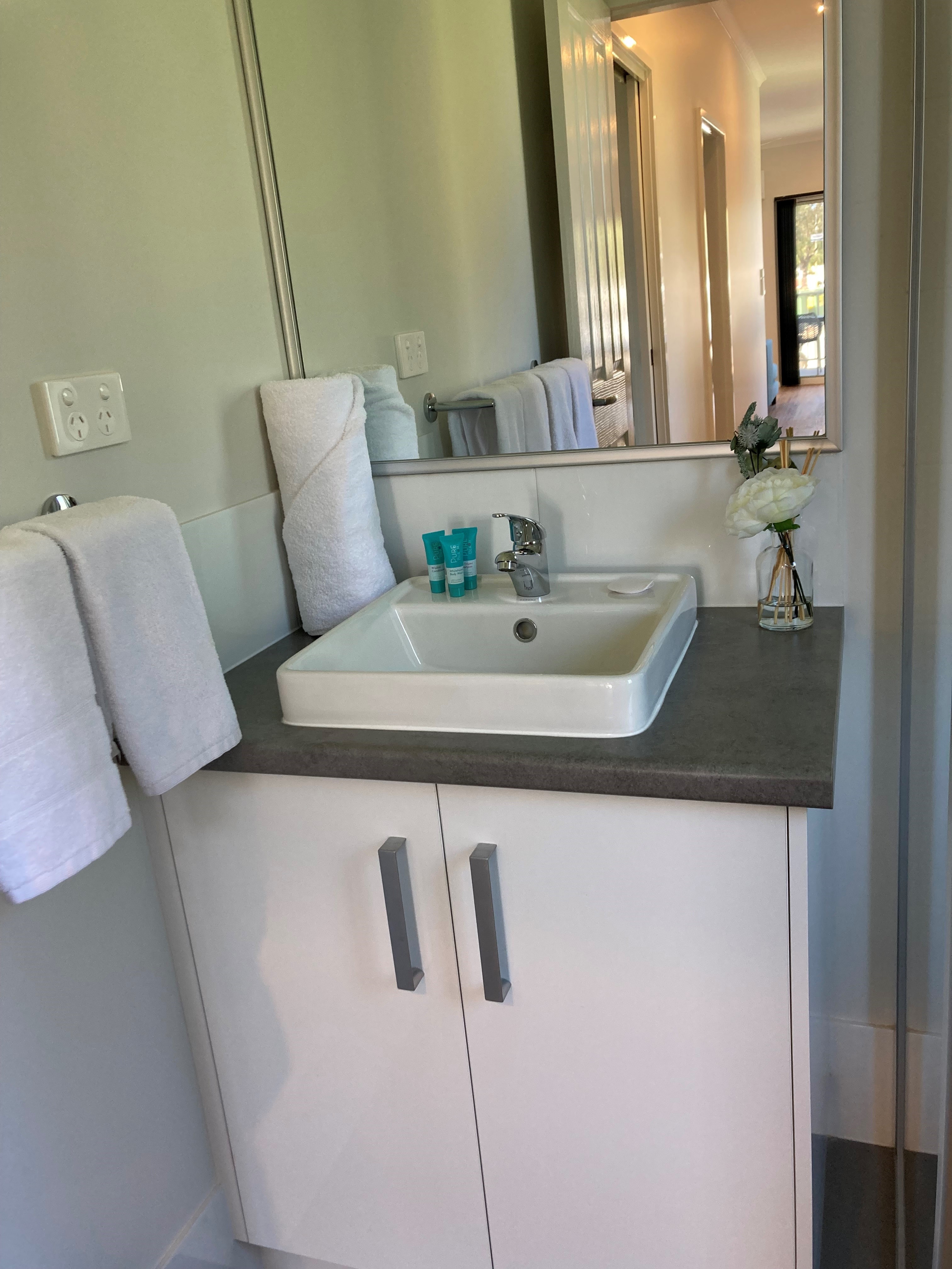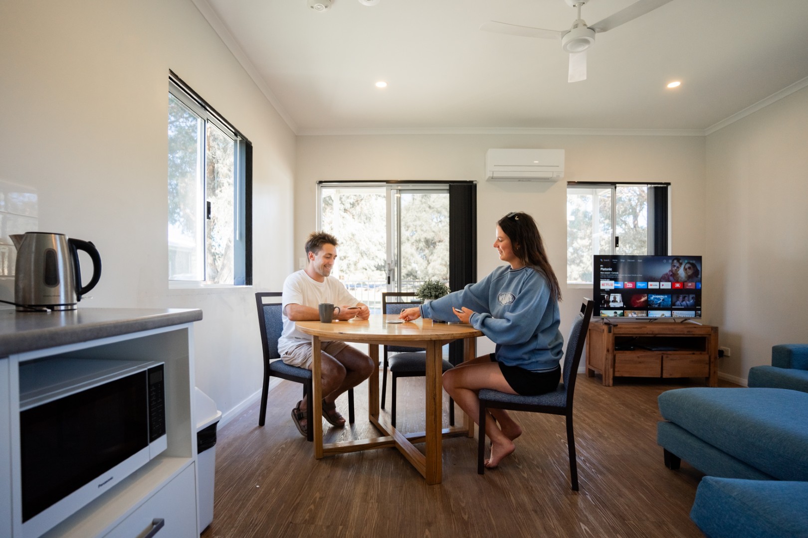 Living area, featuring an outdoor deck overlooking the grounds. Kitchen facilities including cooking utensils, crockery, cutlery, fridge and with stove top and microwave, smart TV, reverse cycle air conditioning. Bathroom with toilet.