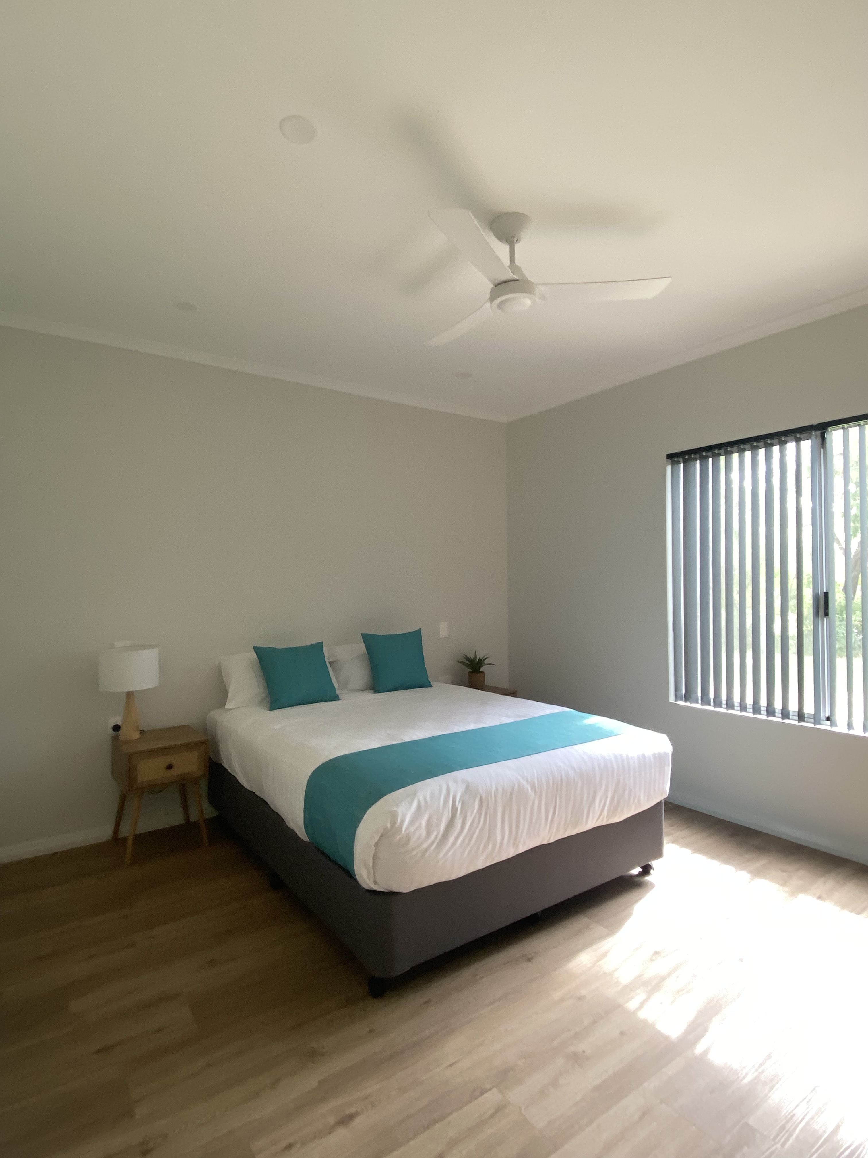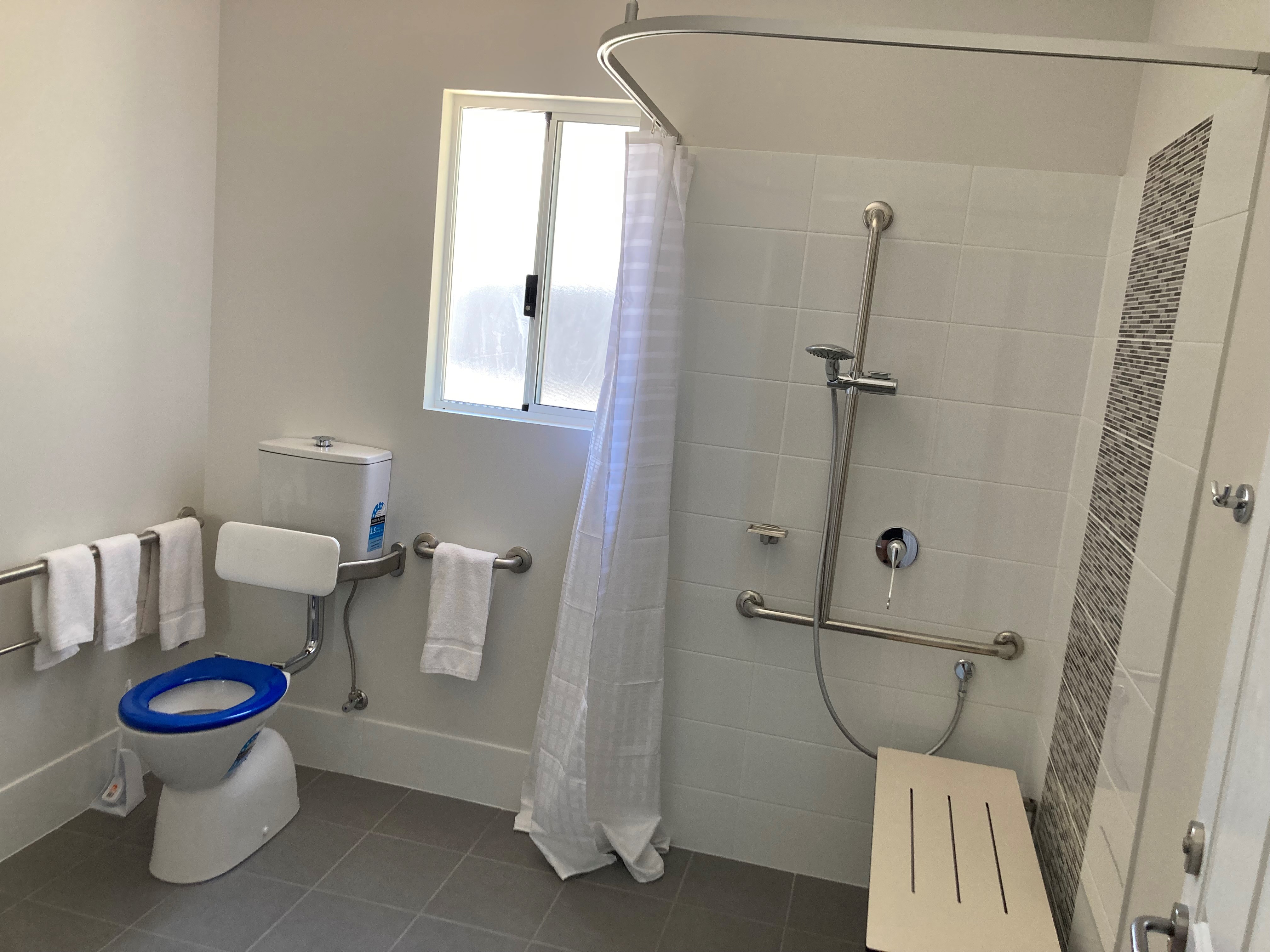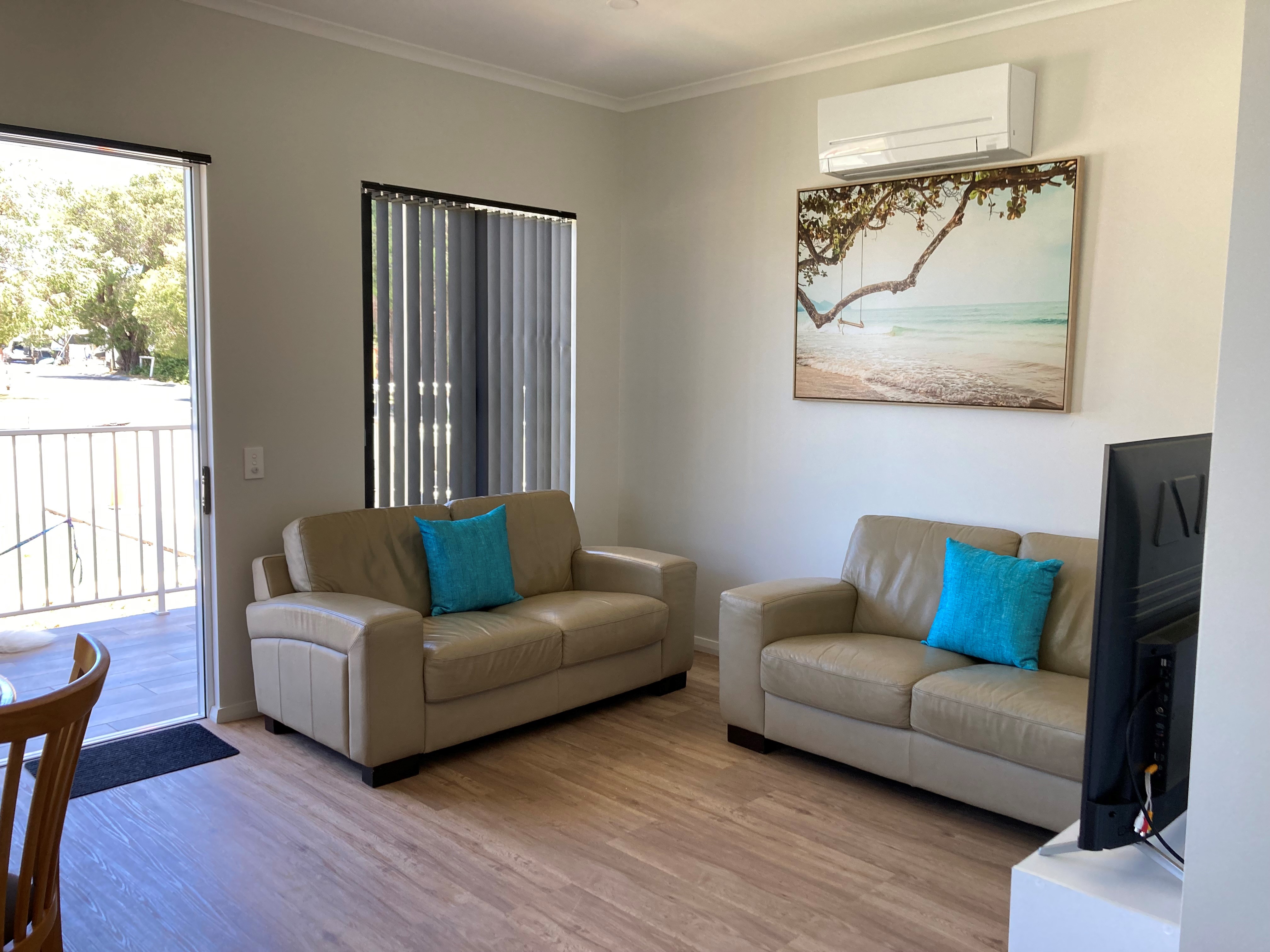 All-inclusive mobility friendly kitchen with stove top, microwave, reverse-cycle air conditioning with comfortable lounges and a smart TV in living area.