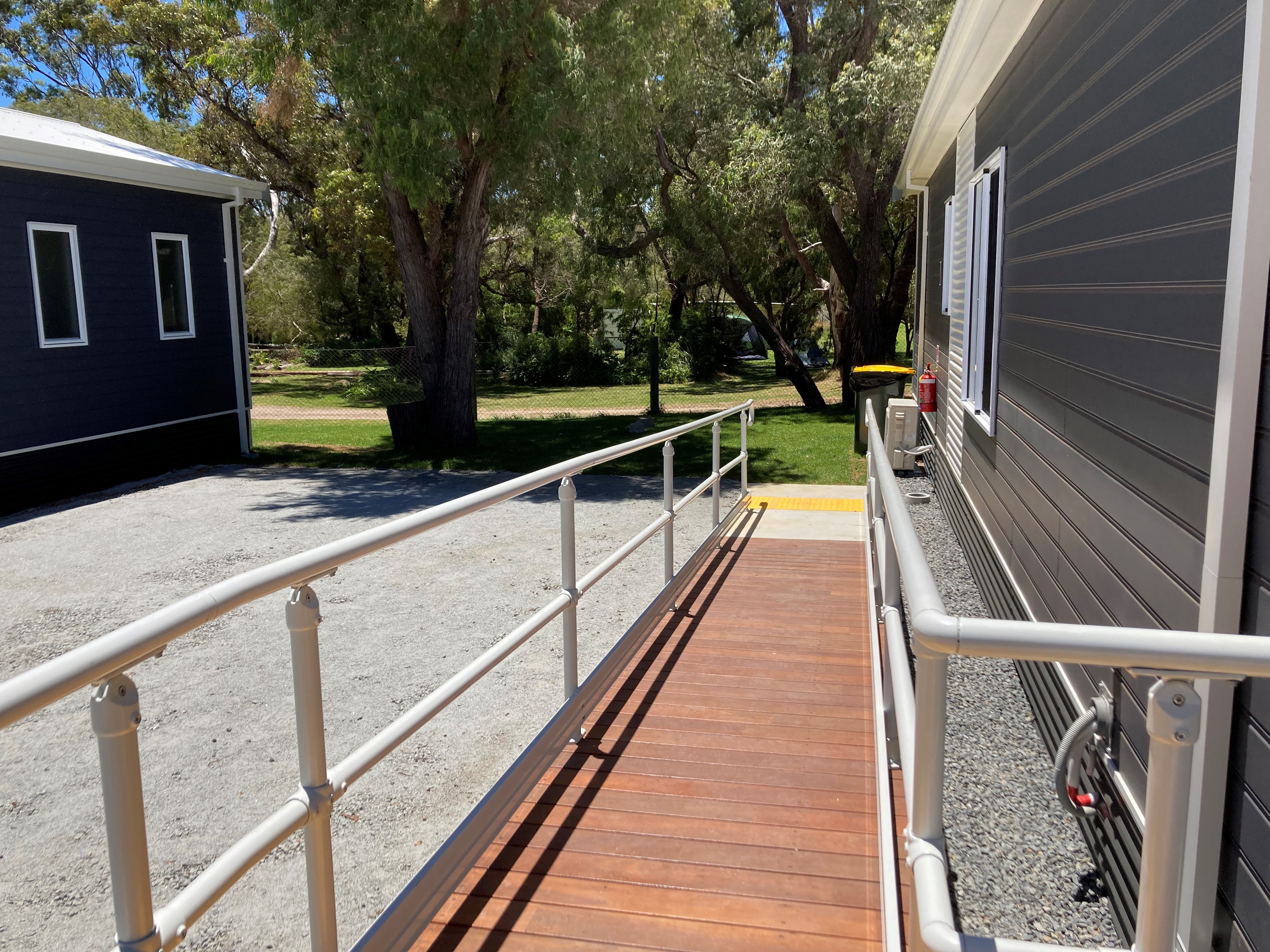 Modern Superior Cabin wheelchair friendly with quality furnishings and lovely presentation, living area featuring an outdoor deck overlooking the grounds.
