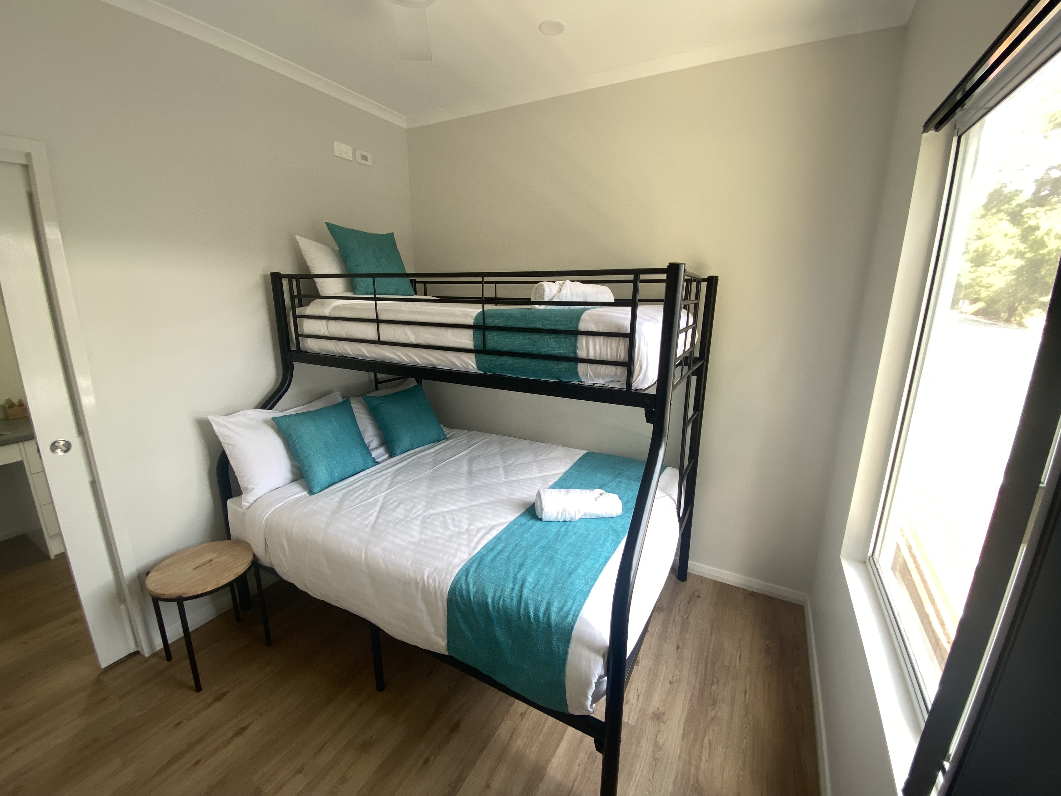 Main bedroom has a queen bed, and the second bedroom has a queen bunk style bed with a single bed on top, sleeping a total of 5 people. All linen is provided.