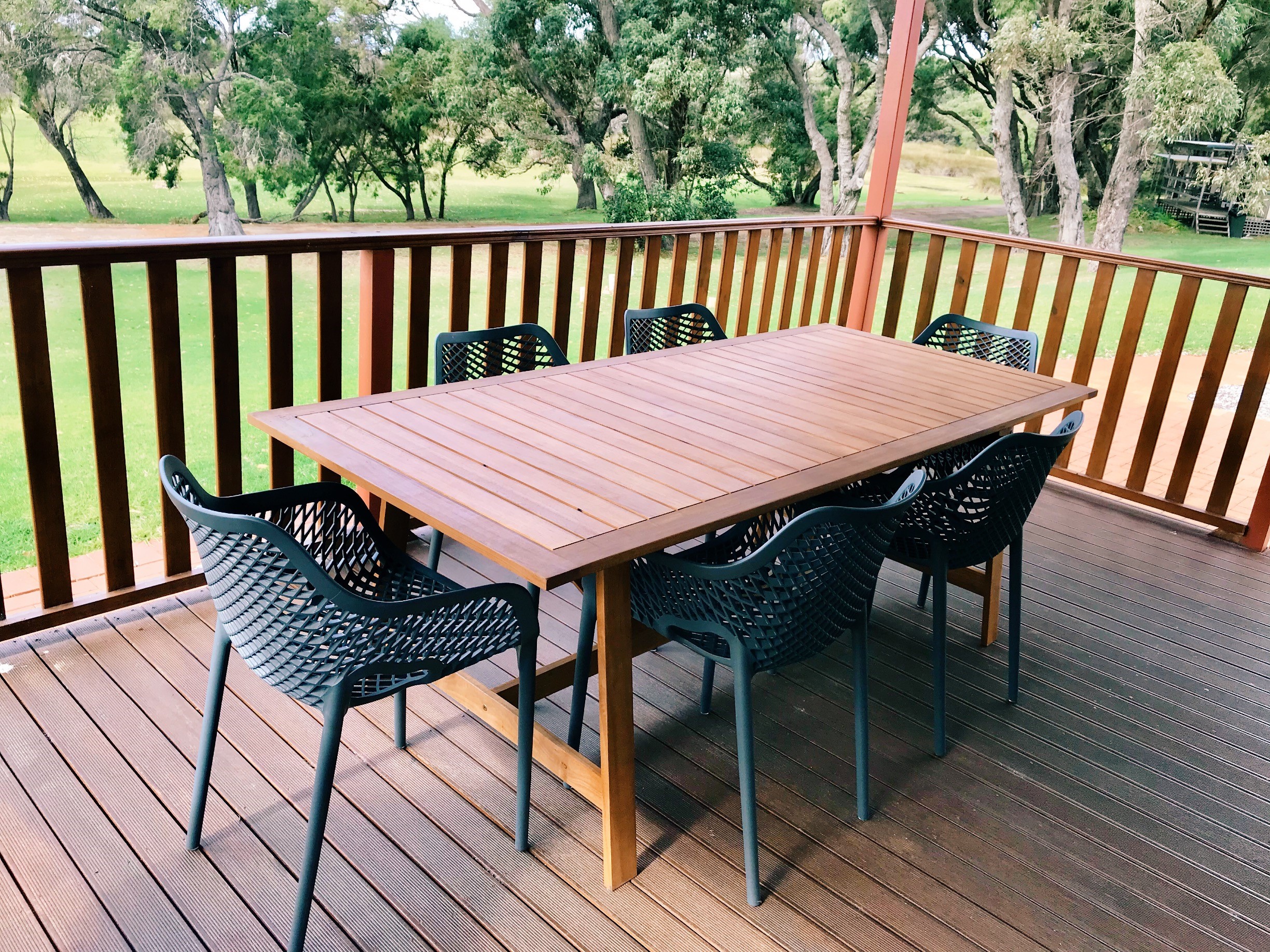 Comfortable lounges and dining in a spacious living area, including an outdoor deck area.