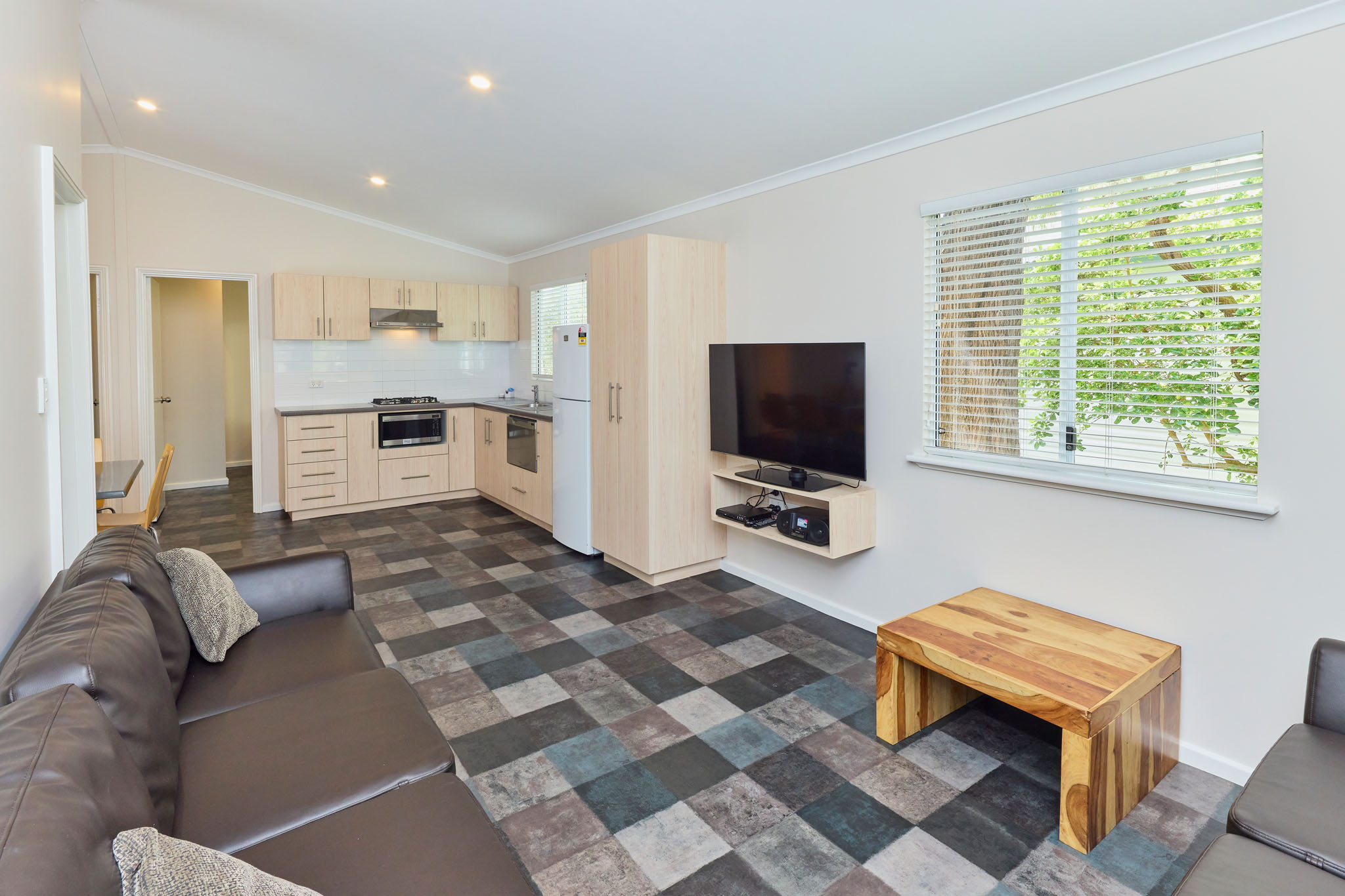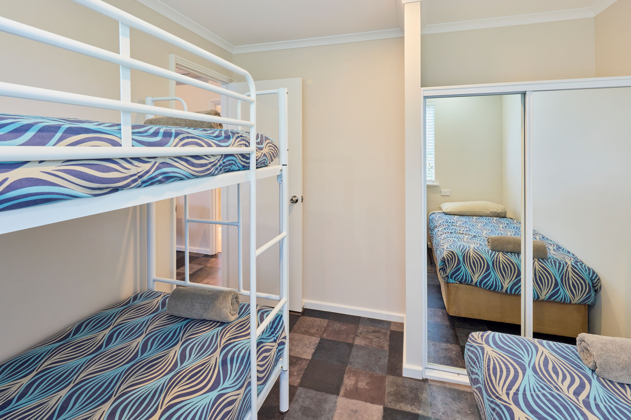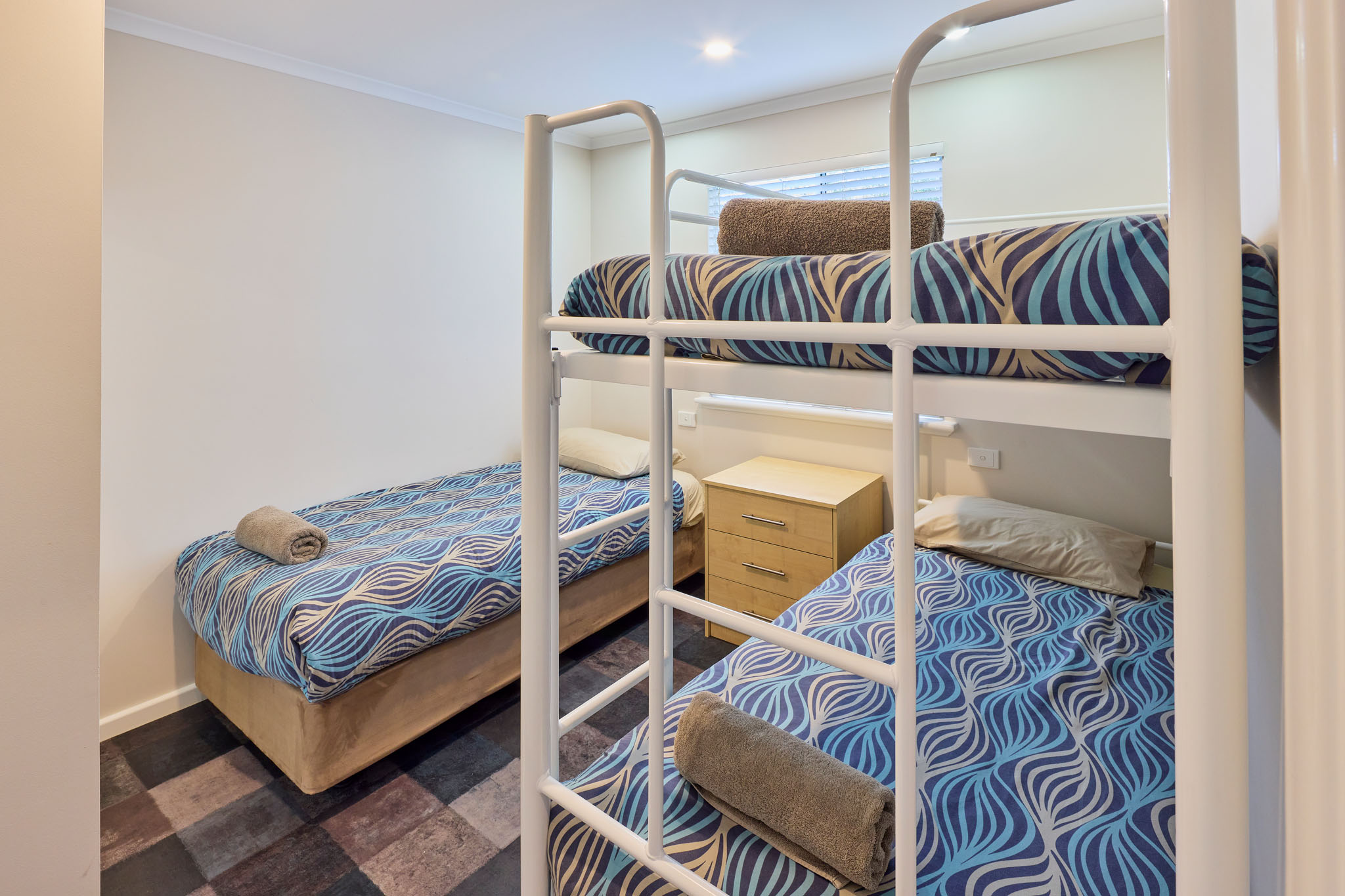 Busselton Family accommodation at its best with a queen bed a set of bunks and three single beds, everyone can stay comfortably in our Three Bedroom Superior Chalet. It’s ideal if you are planning to invite visitors on your holiday.