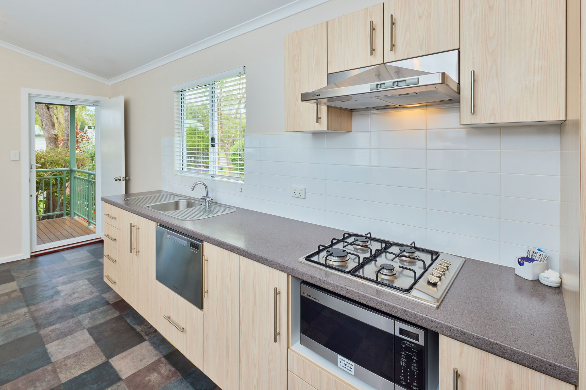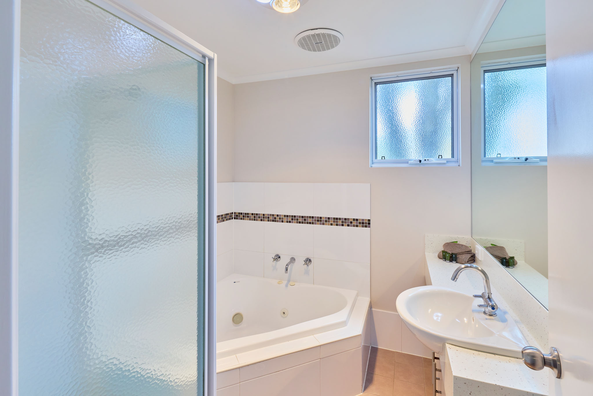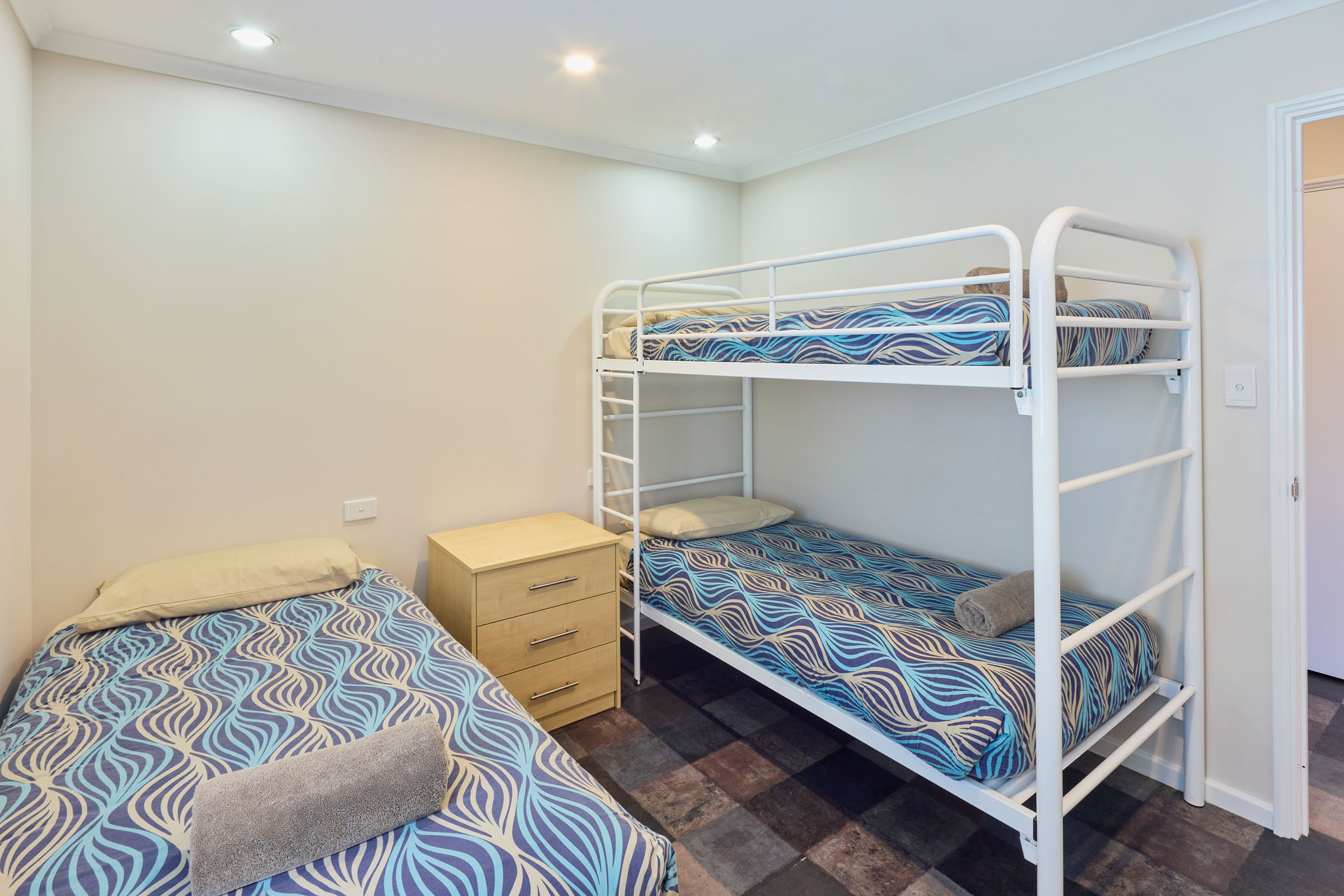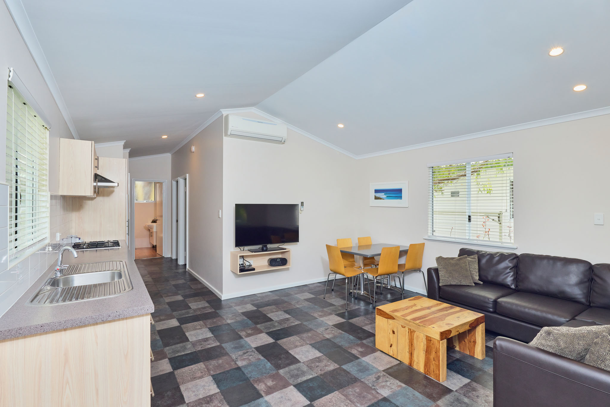 With a spacious open-plan air-conditioned living area, complete kitchen including dishwasher, laundry, dining and lounge room with LCD TV, DVD & CD player, you will find all the comforts of home and more in these chalets. With a queen bed and a single bed and set of bunks, it sleeps up to five people with maximum comfort and the corner spa bath means ultimate wind down time on your holiday!