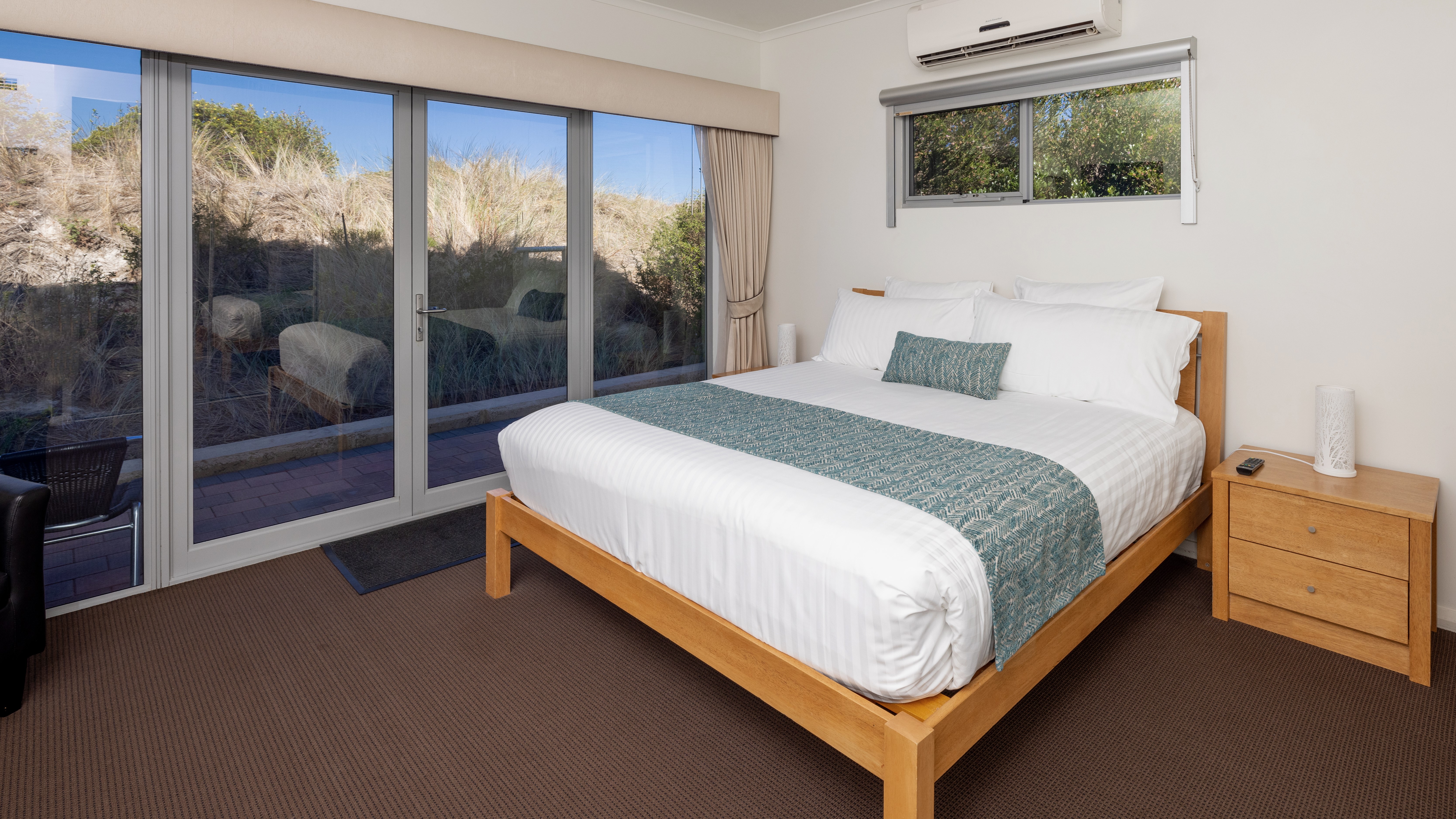 The Beach House features a king bed in the master bedroom with private ensuite, flatscreen TV and courtyard. There's a queen bed in the second bedroom and two sets of bunks in the third bedroom.