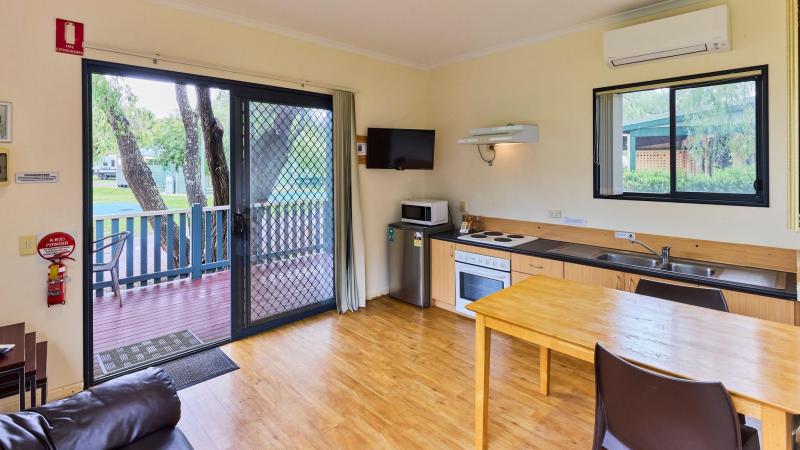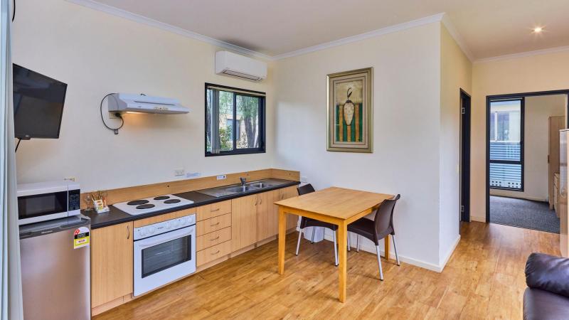 Accommodation facilities include a kitchenette with a fridge, oven, stovetop and microwave, a bathroom, lounge, and dining area with a TV, plus a veranda with outdoor dining.
