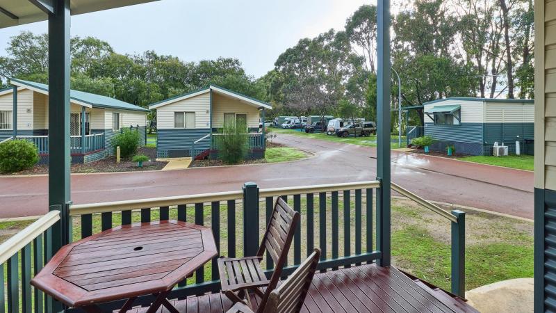 The facilities include a bathroom, full kitchen with fridge, microwave, oven and stovetop, lounge, and dining area with a TV, plus a spacious veranda with outdoor dining. The cabin features ceiling fans and air-conditioning for year-round comfort.