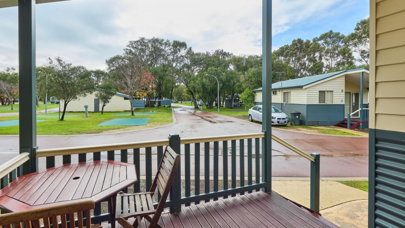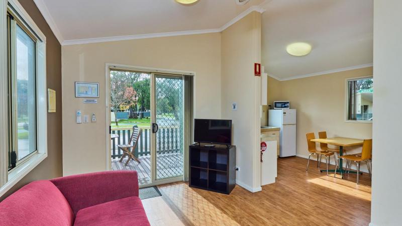 The facilities include a full kitchen with microwave, stovetop, fridge and oven, lounge and dining area with TV, a bathroom, and a veranda with outdoor dining. The cabin has air-conditioning and ceiling fans.