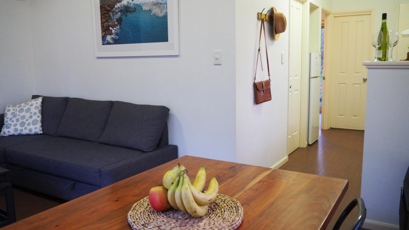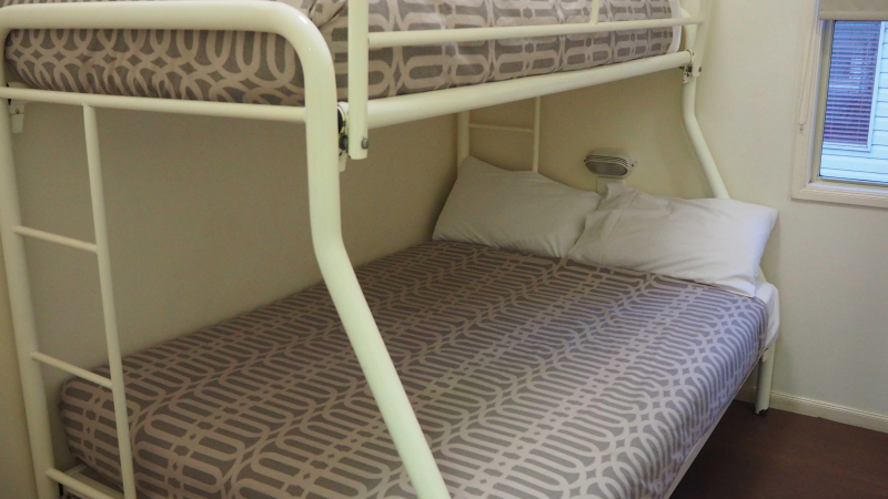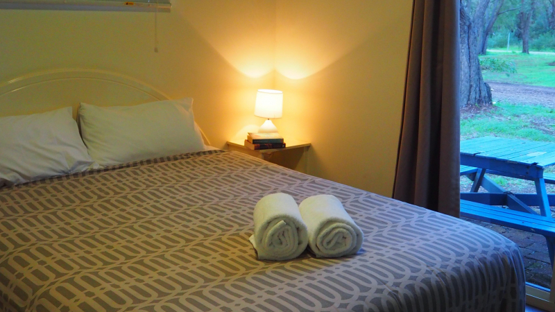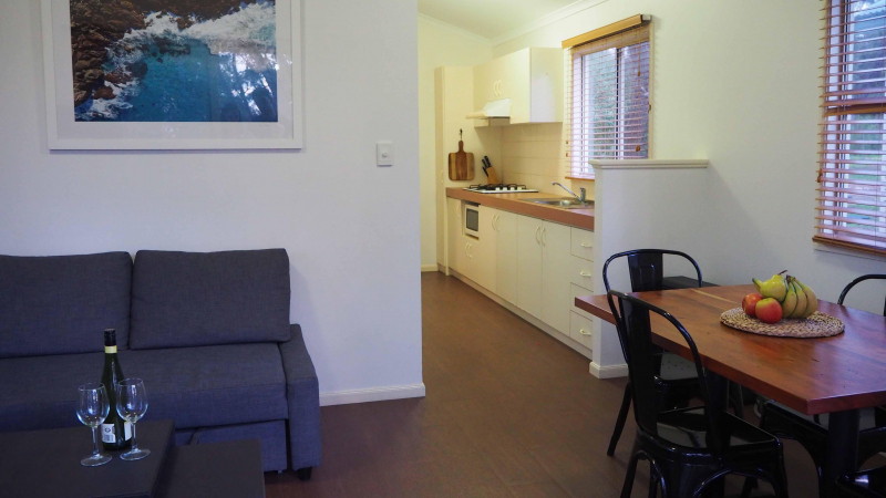 This classic cabin is ideal for family getaways or group trips, providing a self-contained experience without the hassle of pitching a tent! It features air conditioning and heating for year-round comfort. Bedroom 1 has a queen bed, while Bedroom 2 includes a double bed with a single bunk above. The loungeroom offers a TV with an HDMI port and a pull-out sofa bed for extra sleeping space. The bathroom comes with a shower, toilet, and vanity, and the fully-equipped kitchen has a fridge/freezer, gas stove, and microwave. High chairs and hairdryers are available on request, and each cabin accommodates 5-7 people*. Please note, this is a smoke-free park.